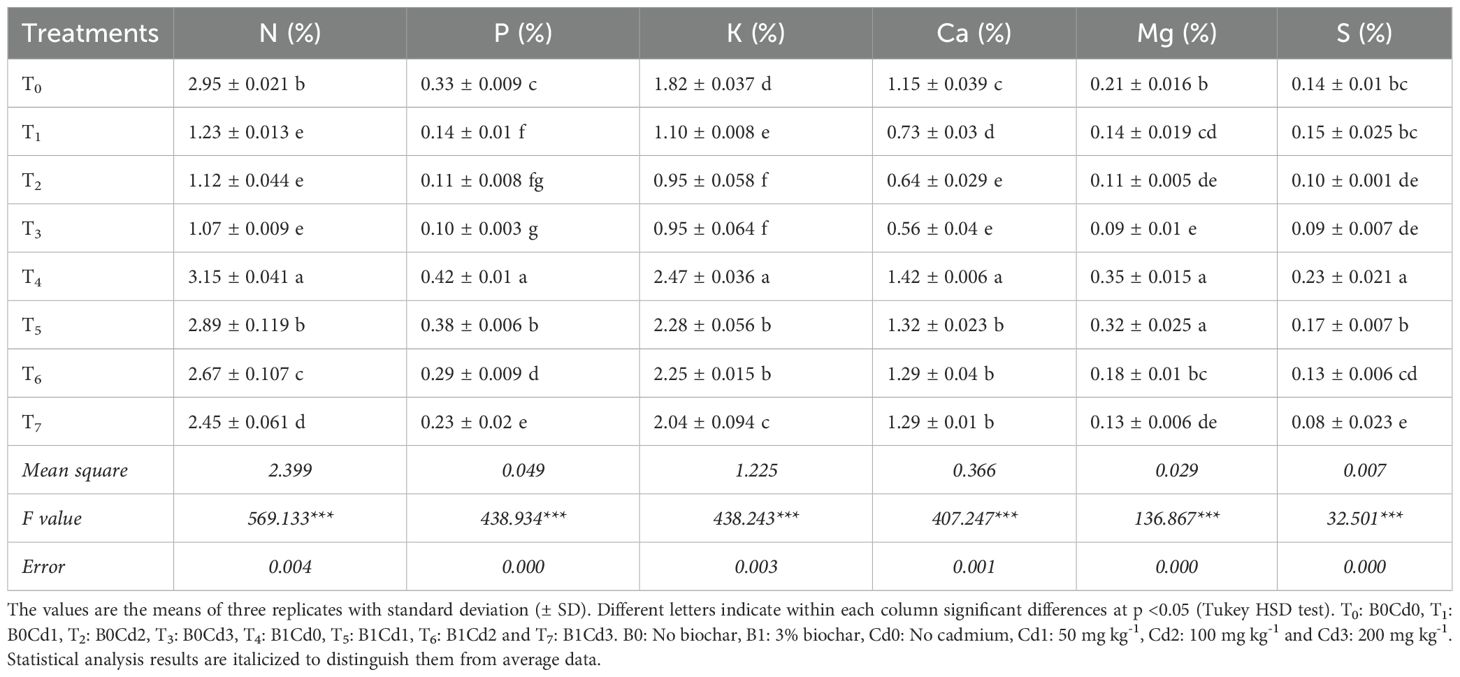 Table 3. Effect of hazelnut shell biochar on N, P, K, Ca, Mg and S content of forage soybean in Cd-contaminated soils (***: p<0.001).