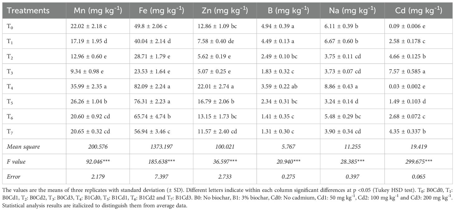 Table 4. Effect of hazelnut shell biochar on Mn, Fe, Zn, B, Na and Cd content of forage soybean in Cd-contaminated soils (***: p<0.001).
