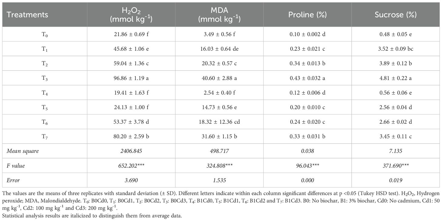 Cadmium stress conditions caused the elevated H2O2 and MDA content in forage soybean plants (Table 5). Plant cell membranes are among the first casualties of stress. In this study, Cd stress in soybean seedlings led to increased MDA production, a marker of membrane lipid peroxidation. Stressors induce the formation of ROS, which play a central role in this membrane damage. ROS accumulation disrupts various cellular components, including membranes, chlorophyll, lipids, proteins, and DNA, ultimately leading to cell death (Yildirim et al., 2021). Plants treated with biochar exhibited lower levels of MDA and H2O2 under Cd stress conditions compared to untreated plants (Table 3). This aligns with previous findings showing biochar’s ability to mitigate ROS production induced by stress. Consistent with this, prior research has demonstrated that biochar application reduces the elevated MDA and H2O2 levels typically observed in stressed plants, likely by lessening the overall impact of stress conditions (Yildirim et al., 2021, 2022). In this study, biochar application decreased proline and sucrose levels in soybean seedlings subjected to Cd stress (Table 5). This reduction likely stems from biochar’s ability to alleviate the detrimental effects of Cd. This aligns with Dadasoglu et al. (2022), who also reported that biochar lowered sucrose and proline content in Cd stressed plants. Biochar application moderated the Cd-induced increase in antioxidant enzyme activity in soybean seedlings (Table 6). Consistent with our findings, studies have shown that biochar reduces the elevated antioxidant enzyme activity associated with stress. For instance, (Gullap et al., 2024a) demonstrated that biochar lowers ROS levels in salinity-stressed bean plants. Biochar has a high surface area and porosity, allowing it to adsorb and immobilize toxic compounds like heavy metals. This prevents the plant from absorbing them, thereby reducing the trigger for ROS production. Biochar can improve soil structure, water retention, and nutrient availability. A healthier soil environment reduces the plant’s overall stress, leading to less ROS generation. Because biochar reduces the initial stress and the resulting ROS overproduction, the plant’s need for a high-level enzymatic defense is diminished. The plant’s internal systems sense that the threat has been mitigated and, in response, downregulate the production and activity of antioxidant enzymes. Therefore, the biochar’s influence is indirect. It’s not a direct command to the plant’s genes to “turn down” enzyme production. Instead, it’s an environmental modification that creates a less stressful condition. The decrease in enzyme activity is a downstream effect, a sign that the plant is no longer in a state of high alert.