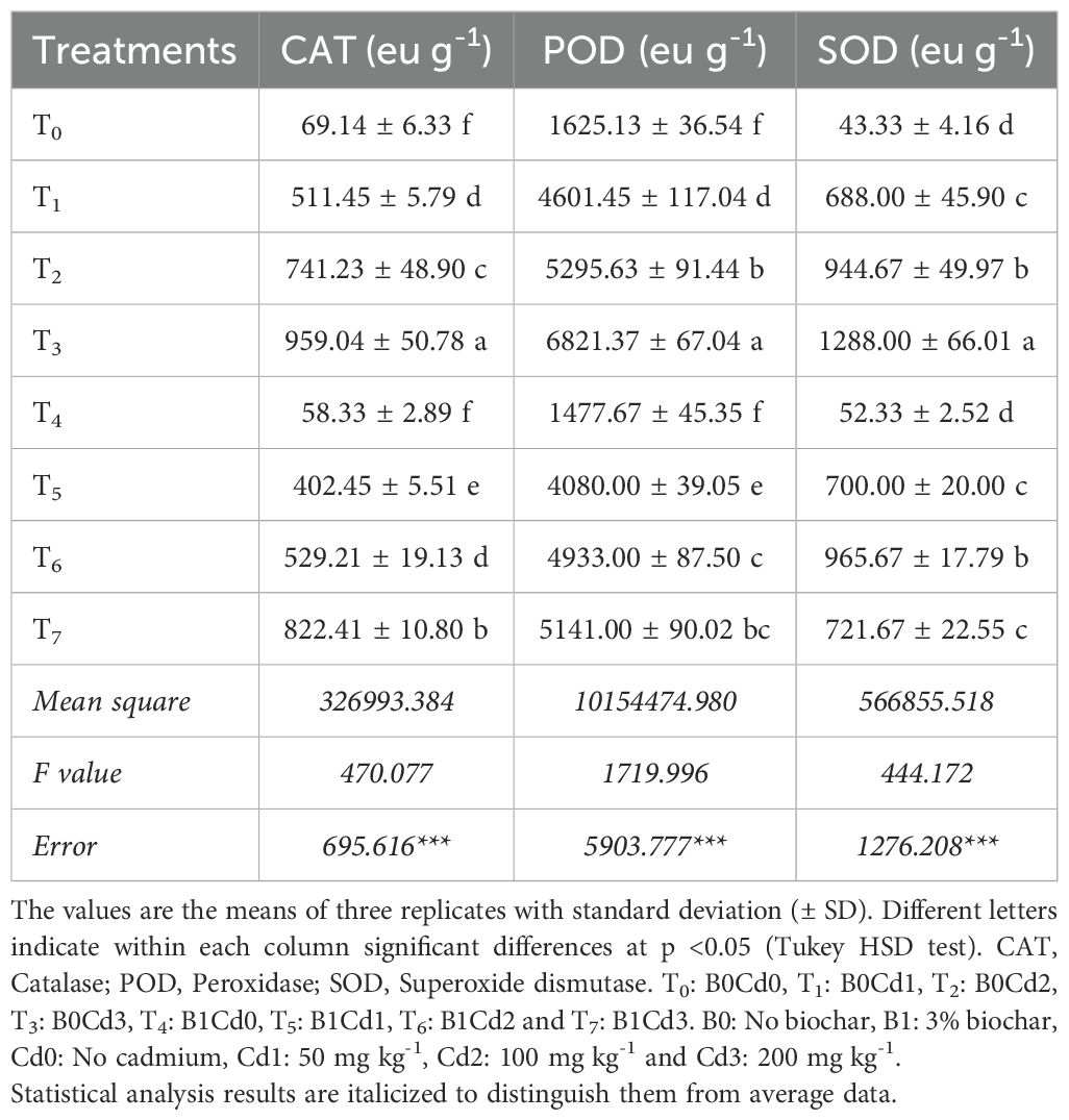 Table 6. Effect of hazelnut shell biochar on antioxidant enzyme activities of forage soybean in Cd-contaminated soils (***: p<0.001).