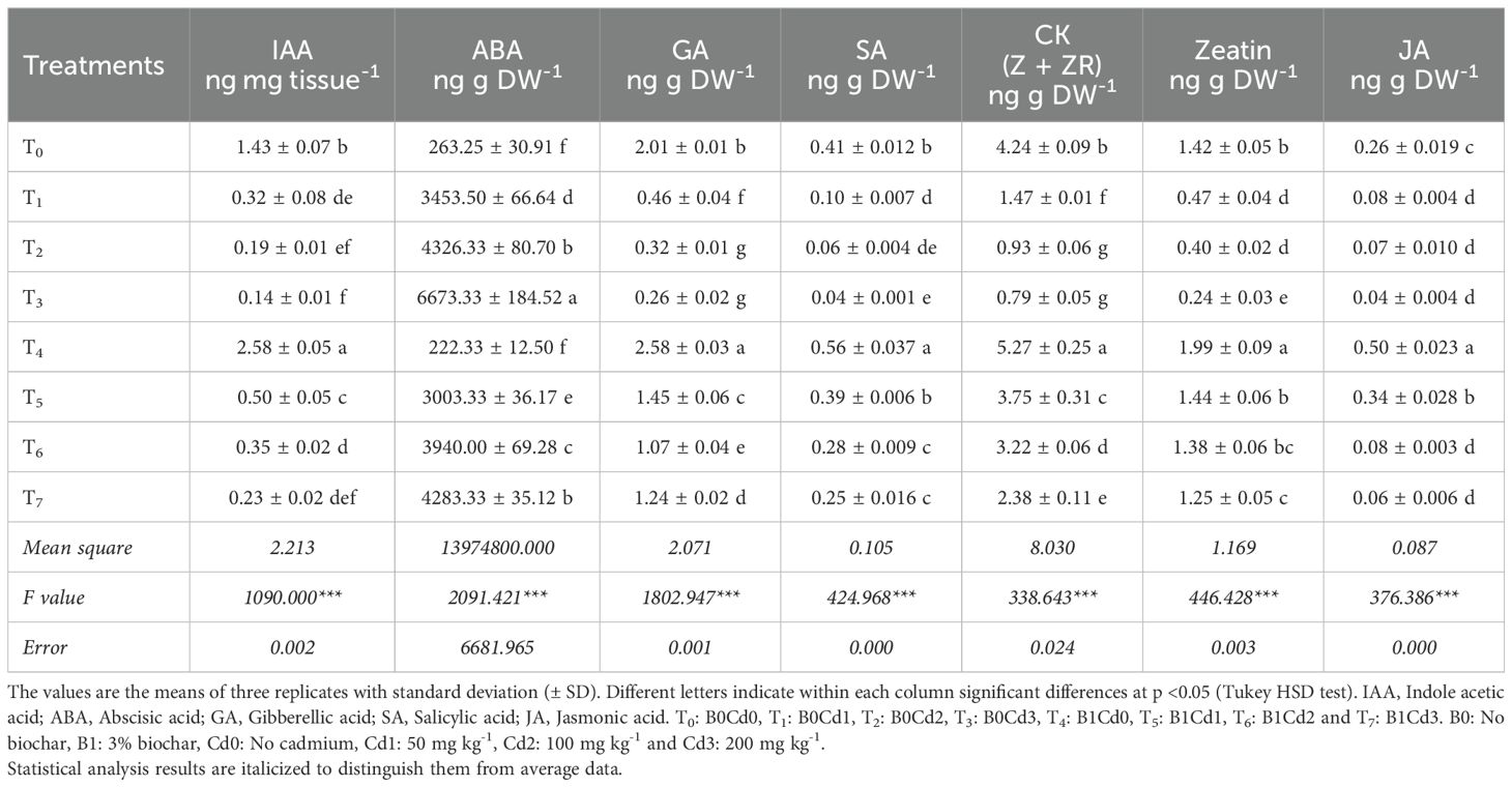 Table 7. Effect of hazelnut shell biochar on the growth hormone content of forage soybean in Cd-contaminated soils (***: p<0.001).
