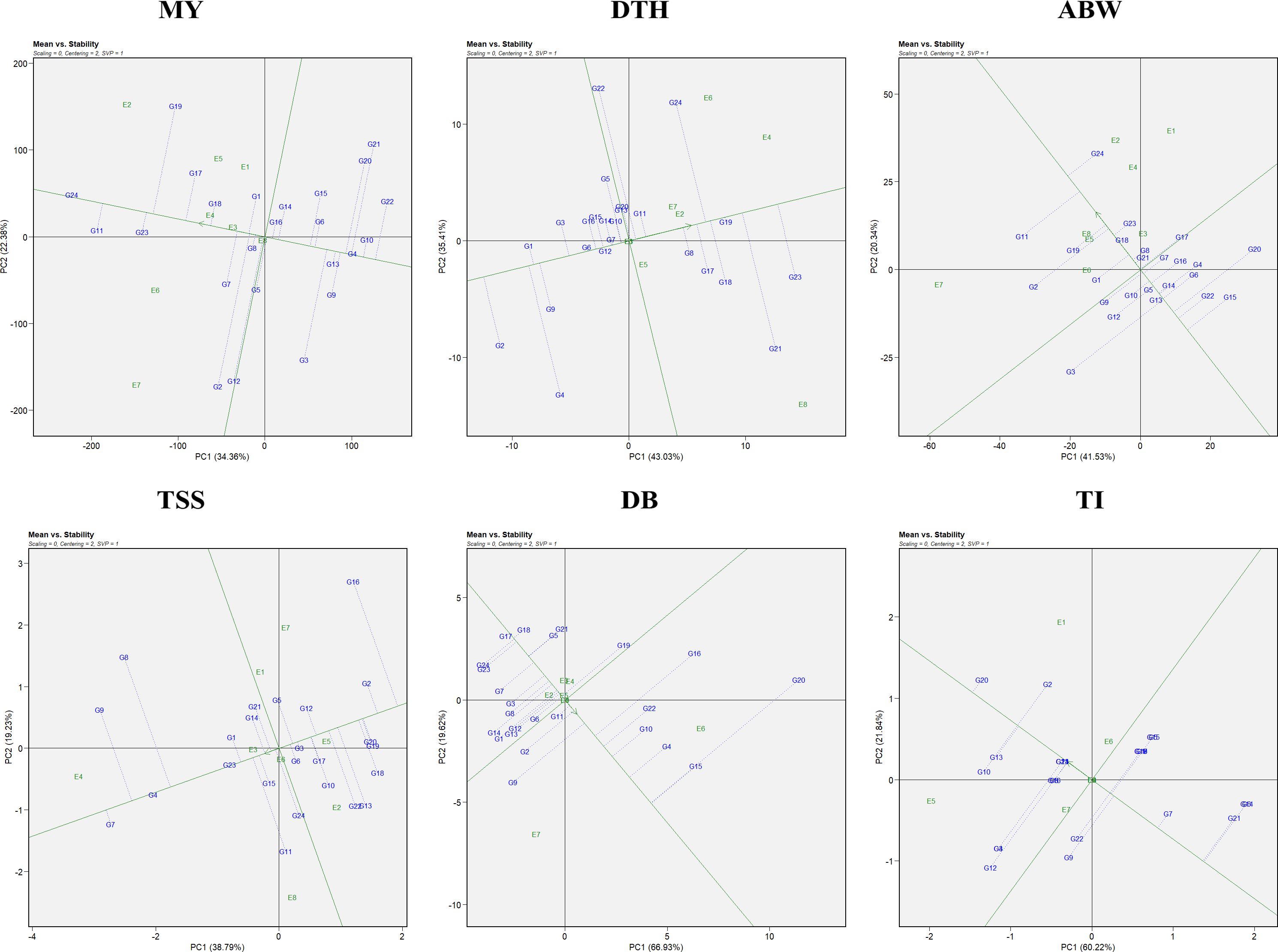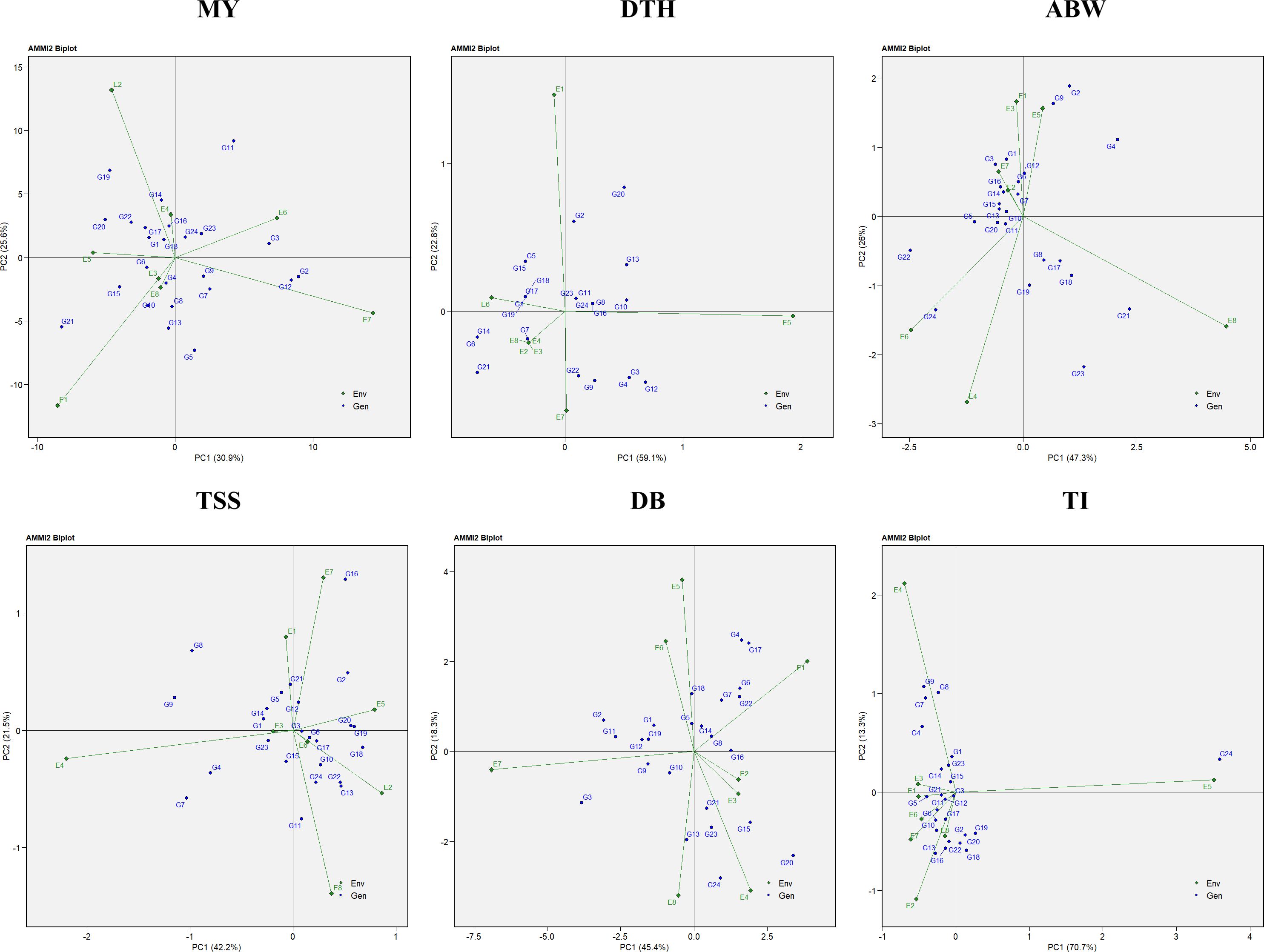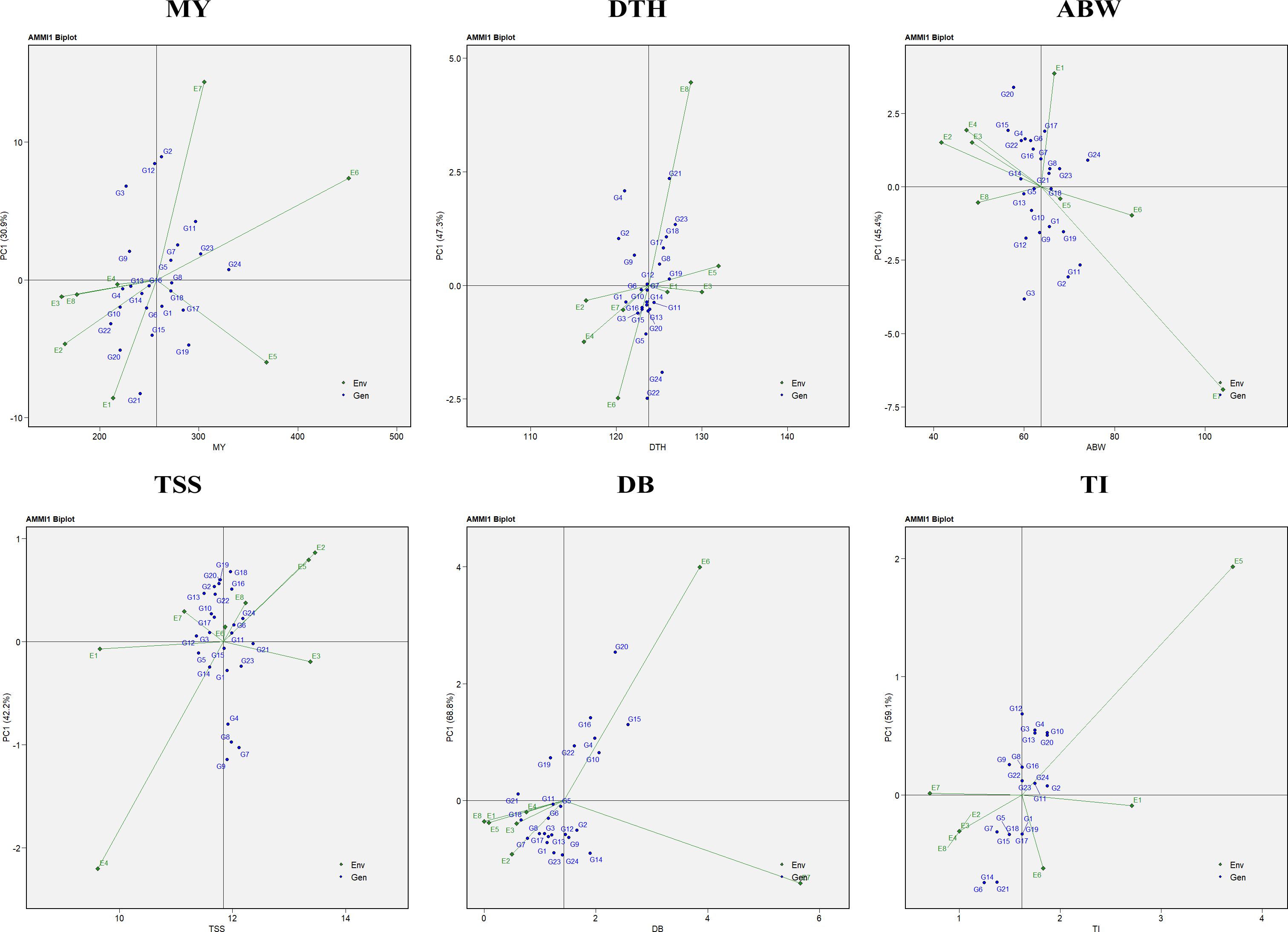 Figure 10. AMMI-2 biplot representation of onion genotypes across eight diverse environments for the evaluated traits: MY, marketable yield; DTH, days to harvest; ABW, average bulb weight; TSS, total soluble solids; DB, double bulb formation; and TI, thrips incidence.