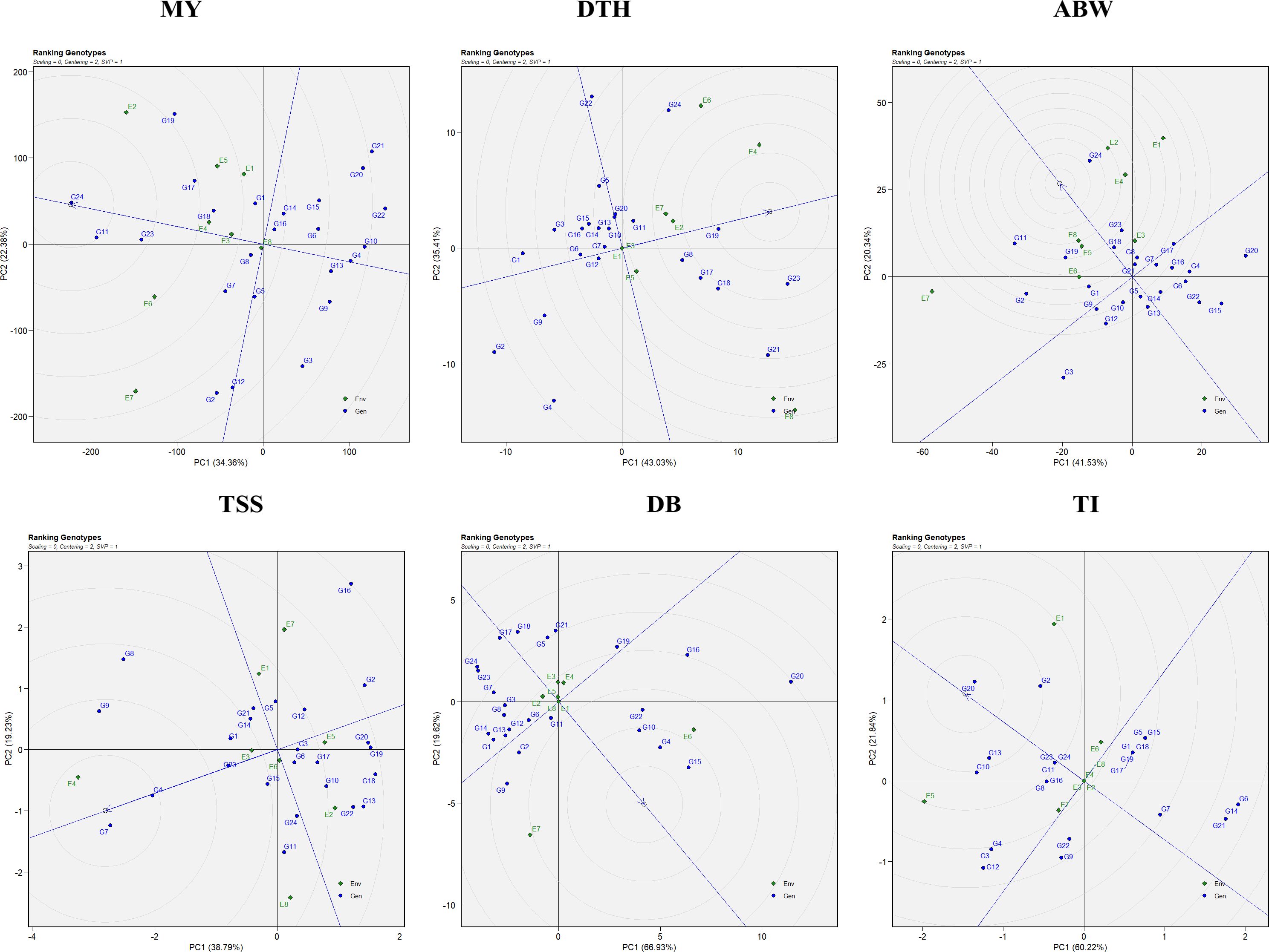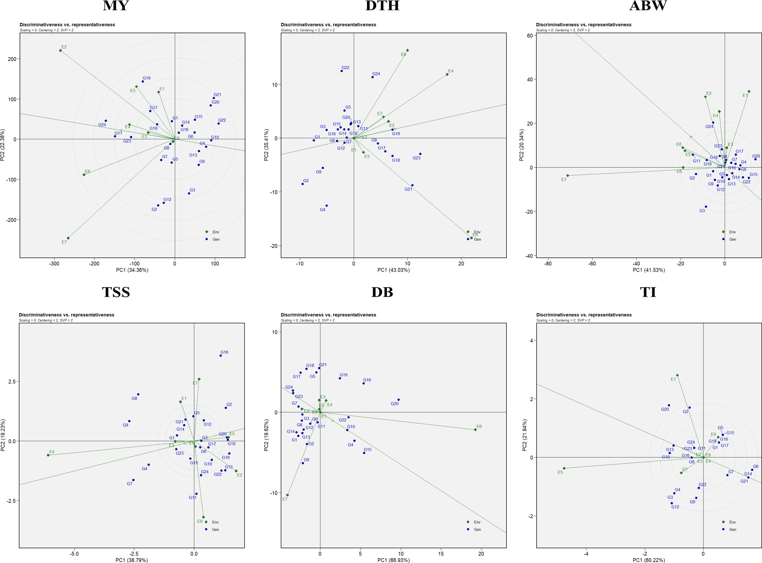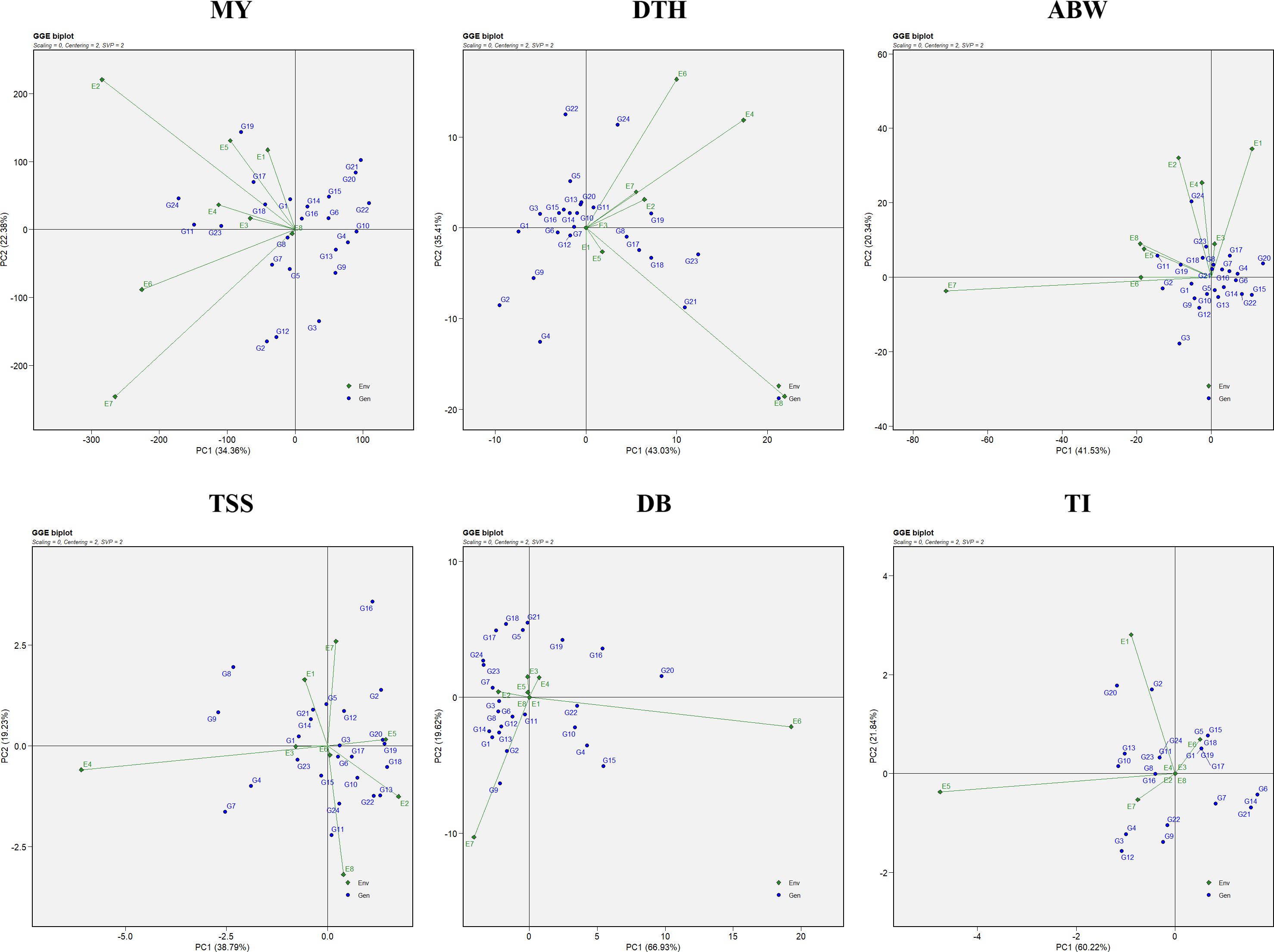 Figure 10. AMMI-2 biplot representation of onion genotypes across eight diverse environments for the evaluated traits: MY, marketable yield; DTH, days to harvest; ABW, average bulb weight; TSS, total soluble solids; DB, double bulb formation; and TI, thrips incidence.