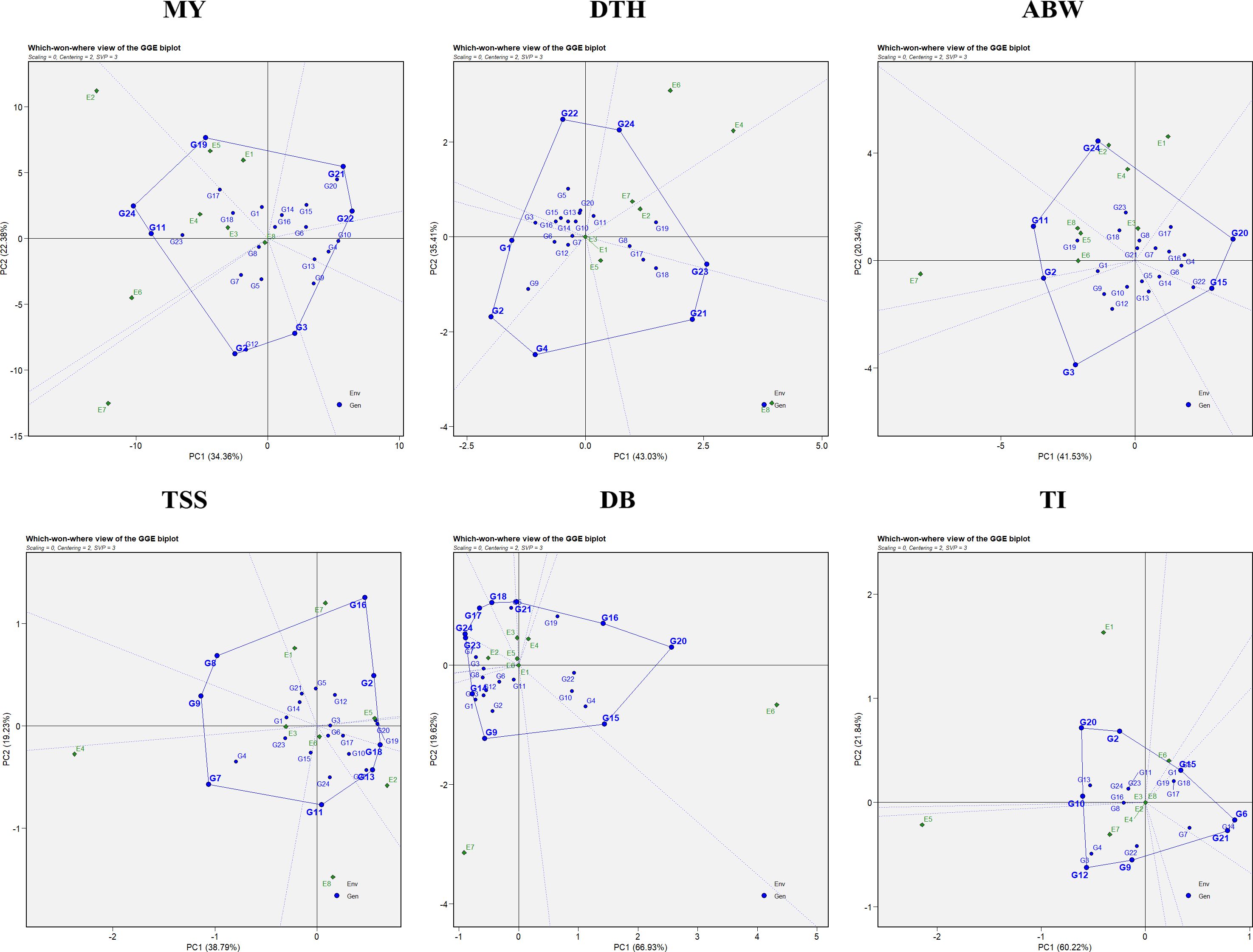 Figure 3. Which-won-where polygon view of the GGE biplot for evaluated traits: MY: marketable yield; DTH: days to harvest; ABW: average bulb weight; TSS: total soluble solids; DB: double bulb formation; and TI: thrips incidence.