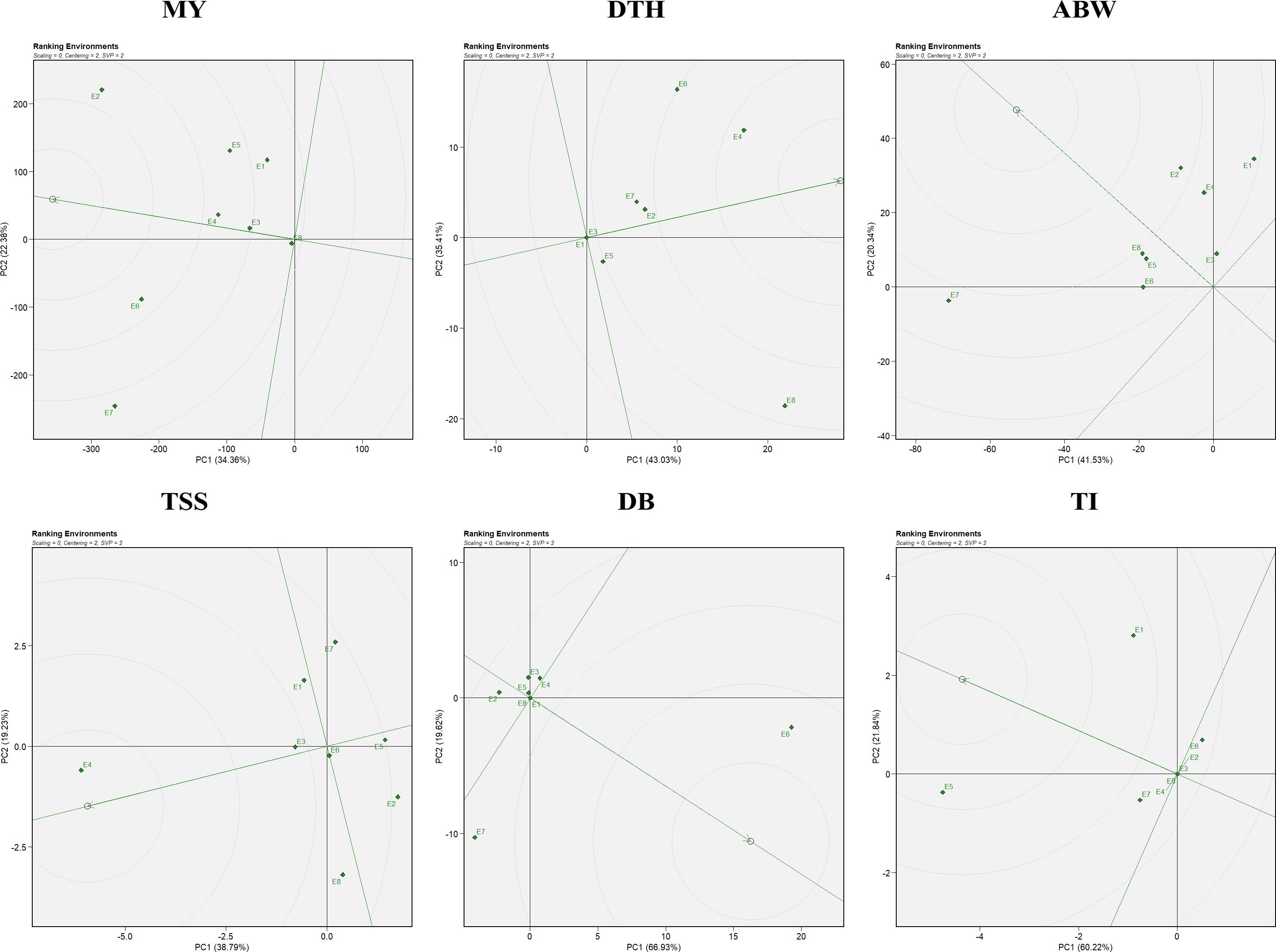 Figure 6. Ranking environments view of the GGE biplot for the evaluated traits: MY: marketable yield; DTH, days to harvest; ABW, average bulb weight; TSS, total soluble solids; DB, double bulb formation; and TI, thrips incidence.