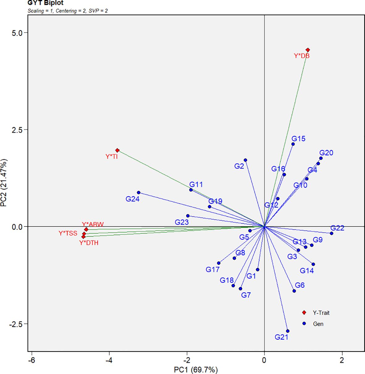 Figure 7. Genotype-by-yield × trait (GYT) biplot illustrating yield-trait associations and multi-trait performance for 24 red onion genotypes evaluated across eight rabi environments. Traits: DTH (days to harvest), ABW (average bulb weight), TSS (total soluble solids), DB (double bulb formation), and TI (thrips incidence).