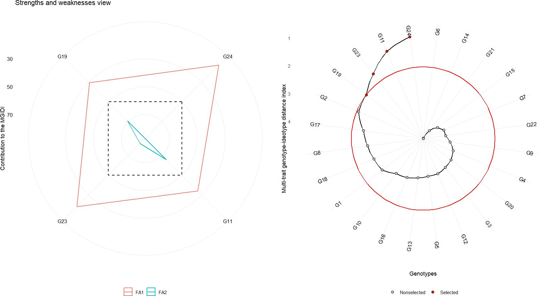 Figure 8. Multi-trait selection of 24 red onion genotypes across eight rabi environments using the MGIDI. Left panel: Strengths and weaknesses view showing the contribution of each trait to MGIDI for the first two factors (FA1 and FA2). Right panel: Genotype-ideotype distance plot, with genotypes closer to the red circle representing selections approaching the ideotype. Selected genotypes are shown in red dots; non-selected genotypes are shown in black dots.
