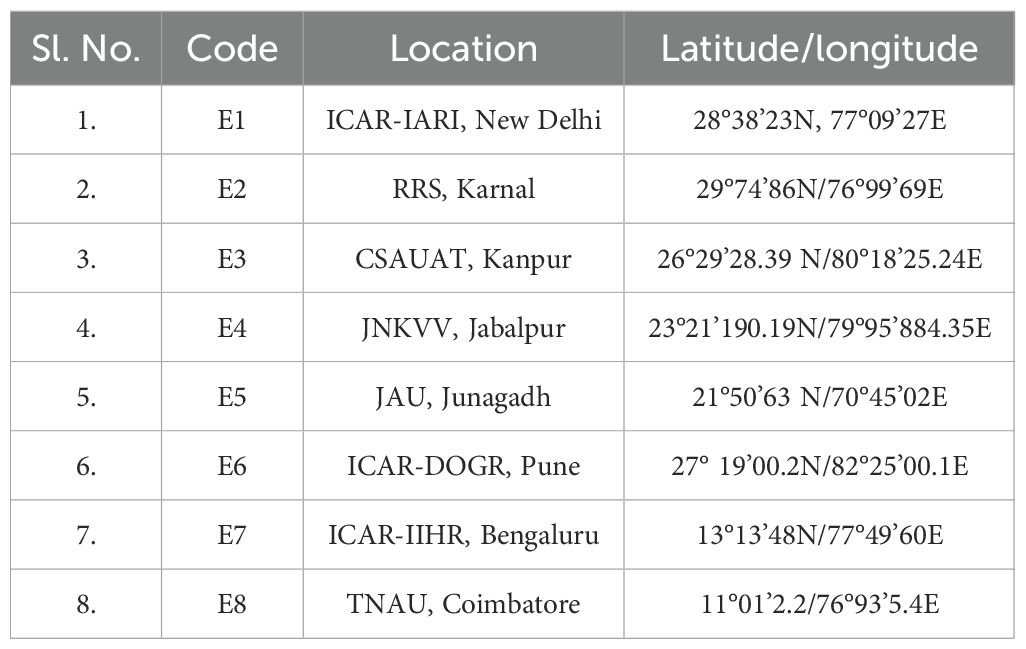 Table 1. Geographic details of the eight research environments (E1-E8) representing fixed locations evaluated across two consecutive rabi seasons (2023-24).