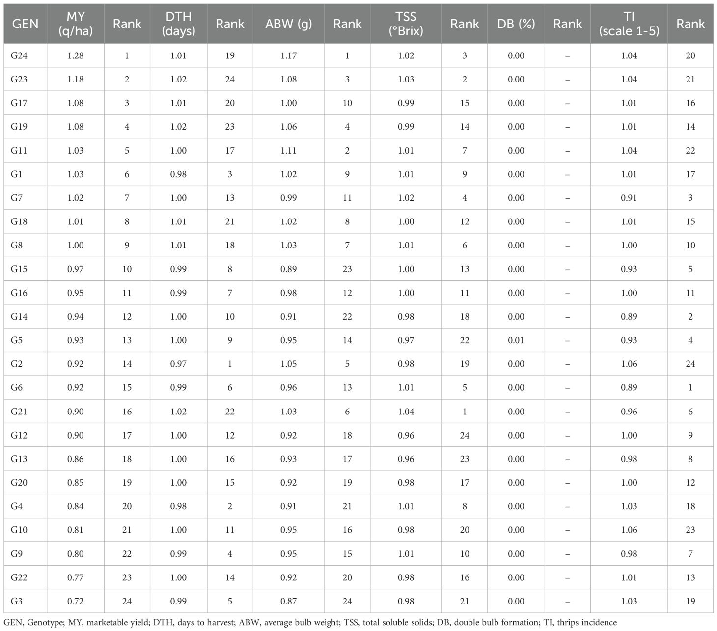 In the case of days to harvest, the most stable genotypes were G6 (RO-1642), G12 (RO-1741), G19 (RO-1773), and G7 (RO-1654), while G1 (RO-1619), G6 (RO-1642), G12 (RO-1741), and G7 (RO-1654) demonstrated both earliness and stability across environments. For average bulb weight, stability was greatest in G18 (RO-1770), G5 (RO-1625), and G13 (RO-1747). Notably, genotypes G24 (Bhima Shakti), G19 (RO-1773), G23 (Bhima Kiran), and G18 (RO-1770) emerged as both productive and stable. For TSS, genotypes G4 (RO-1622), G23 (Bhima Kiran), and G3 (RO-1621) were identified as the most stable, whereas G7 (RO-1654), G4 (RO-1622), and G23 (Bhima Kiran) excelled in both performance and stability. For double-bulb formation, genotypes G17 (RO-1769), G18 (RO-1770), G24 (Bhima Shakti), and G23 (Bhima Kiran) had the lowest values, with G17 (RO-1769), G18 (RO-1770), and G11 (RO-1672) being both stable and superior in performance. For thrips incidence, G23 (Bhima Kiran) and G24 (Bhima Shakti) demonstrated high stability. Notably, G7 (RO-1654), G23 (Bhima Kiran), and G24 (Bhima Shakti) were identified as ideal genotypes with both low thrips incidence and consistent performance.