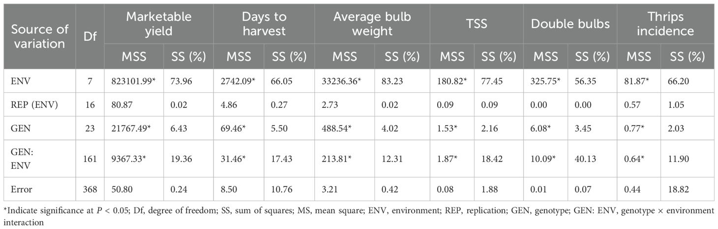 Onion is predominantly an outcrossing species, which promotes extensive genetic variability among genotypes. This intrinsic variability underpins both the potential for rapid genetic gain through hybridization and the pronounced GEI commonly observed in multilocation trials. Stability and adaptability assessments help identify consistently performing genotypes across varying environmental conditions (Becker and Leon, 1988). Environmental variation across locations and years generates significant GEI, complicating selection and necessitating robust multi-environment analyses (Annicchiarico, 2002; Yan and Kang, 2003). Such GEI effects have been reported in onion and other vegetable crops (Cuartero and Cubero, 1982; Yildirim and Caliskan, 1985; Khar et al., 2007; Dia et al., 2018; Tahir et al., 2020; Tignegre et al., 2022; Gupta et al., 2024a). The identification of genotypes with both high mean performance and stability is therefore crucial for the development of cultivars suited to variable agro-climatic regions (Gupta et al., 2022). Onion genotypes are evaluated in multi-environment trials (METs) to identify suitable agro-climatic zones for the release and large-scale cultivation of varieties with consistent performance. Studies on GEI thus provide valuable preliminary insights for guiding breeding strategies.