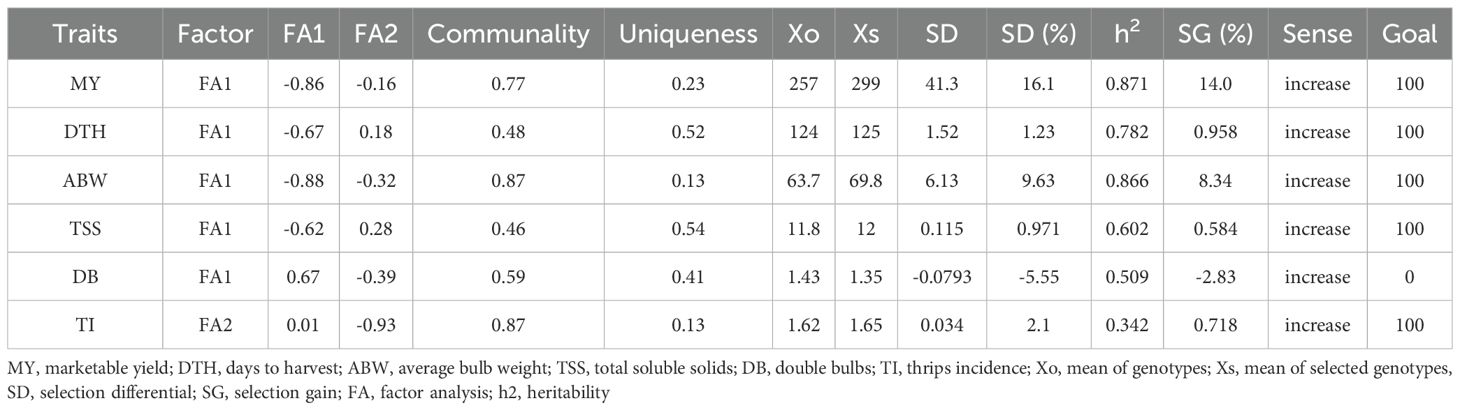 The selection differential based on MGIDI revealed considerable variability in expected genetic gain across the studied traits (Table 5). High communalities were observed for average bulb weight and thrips incidence, followed by marketable yield and double-bulb formation, whereas the lowest communalities were recorded for days to harvest and TSS. High uniqueness was observed for TSS, followed by days to harvest, double-bulb formation, and marketable yield, whereas lower uniqueness was recorded for average bulb weight and thrips incidence. The selection differential was highest for marketable yield, followed by average bulb weight and days to harvest, and lowest for TSS and thrips incidence. The greatest genetic gains were observed for marketable yield (14.0%) and average bulb weight (8.34%), demonstrating the effectiveness of MGIDI-based selection in enhancing key productivity traits. Moderate improvements were noted in days to harvest (0.96%), thrips incidence (0.72%), and TSS (0.58%). Conversely, negative genetic gains were observed for double-bulb formation (–2.83%), which is advantageous since reductions in this trait are desirable for improving bulb quality. Overall, sense of gain was positive for all traits (Table 5).