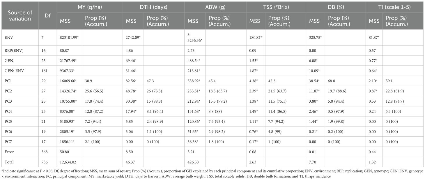 Our study aimed to evaluate how the combination of BLUPs, GGE, and AMMI can identify stable and superior onion genotypes. Combined ANOVA for both GGE and AMMI showed significant GEI at P < 0.05 for all traits evaluated in the tested onion genotypes (Tables 4, 6). This strengthened the predictive accuracy of BLUPs, GGE, and AMMI analyses and enabled the identification of genotypes with either broad or specific adaptability across environments (Akter et al., 2015). The AMMI model captures both additive and multiplicative components of variation, whereas the GGE biplot focuses on genotype and G × E effects, offering better visualization of performance and stability (Gauch, 2006; Yan and Tinker, 2006; Yan et al., 2007). Genotype performance was evaluated using BLUP-derived values rather than simple means, as BLUP provides more accurate and unbiased predictions by accounting for random effects and variance components (Nardino et al., 2016; Sood et al., 2020; Verma and Singh, 2021; Taleghani et al., 2023).