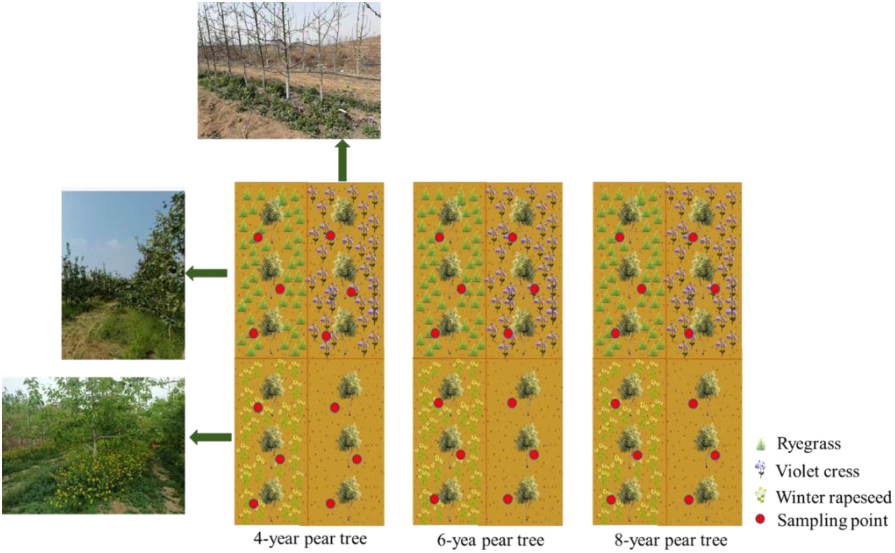 Three cover crops, namely ryegrass, violet cress and winter rapeseed, were grown in a two-factor design and combined with pear trees with 4, 6 and 8 planting years, respectively. The pear trees were planted as control. A total of 12 treatments with three replicates of each were planted with 1.5 × 6 m distance and the area of each block was 54 m². On Apr 16, 2023, three mulching crops were planted between the rows of pear trees. Sampling of mature pear trees was conducted on Sep 2, 2024. Soil samples ranging from 0 to 40 cm were collected in layers for testing and analysis. The 0–40 cm soil profile was selected for layered sampling based on its ecological significance as the primary zone for biological activity and its demonstrated responsiveness to agricultural management interventions, providing optimal detection of carbon sequestration dynamics. Except for planting, the field management of each treatment remains consistent (Figure 2).