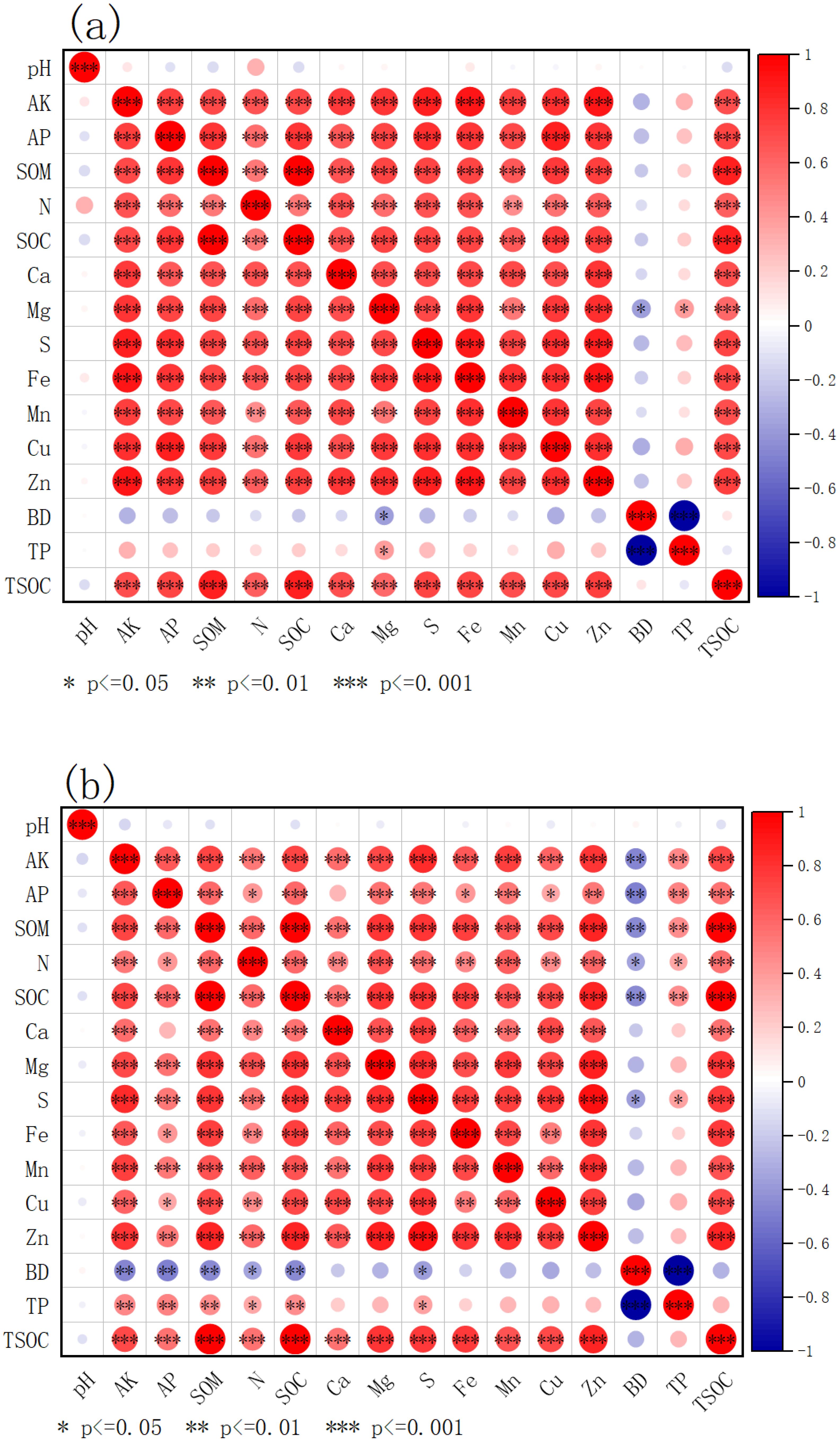 Figure 3. Correlation analysis diagram. (a) 0–20 cm surface soil; (b) 20–40 cm subsoil. AK, available potassium; AP, soil available phosphorus; SOM, soil organic matter; N, soil total nitrogen; SOC, soil organic carbon; pH, soil pH; Ca, exchangeable calcium; Mg, exchangeable magnesium; S, effective sulphur; Fe, effective iron; Mn, effective manganese; Cu, effective copper; Zn, effective zinc; BD, capacitance; TP, total porosity; and TSOC, soil organic carbon stocks.