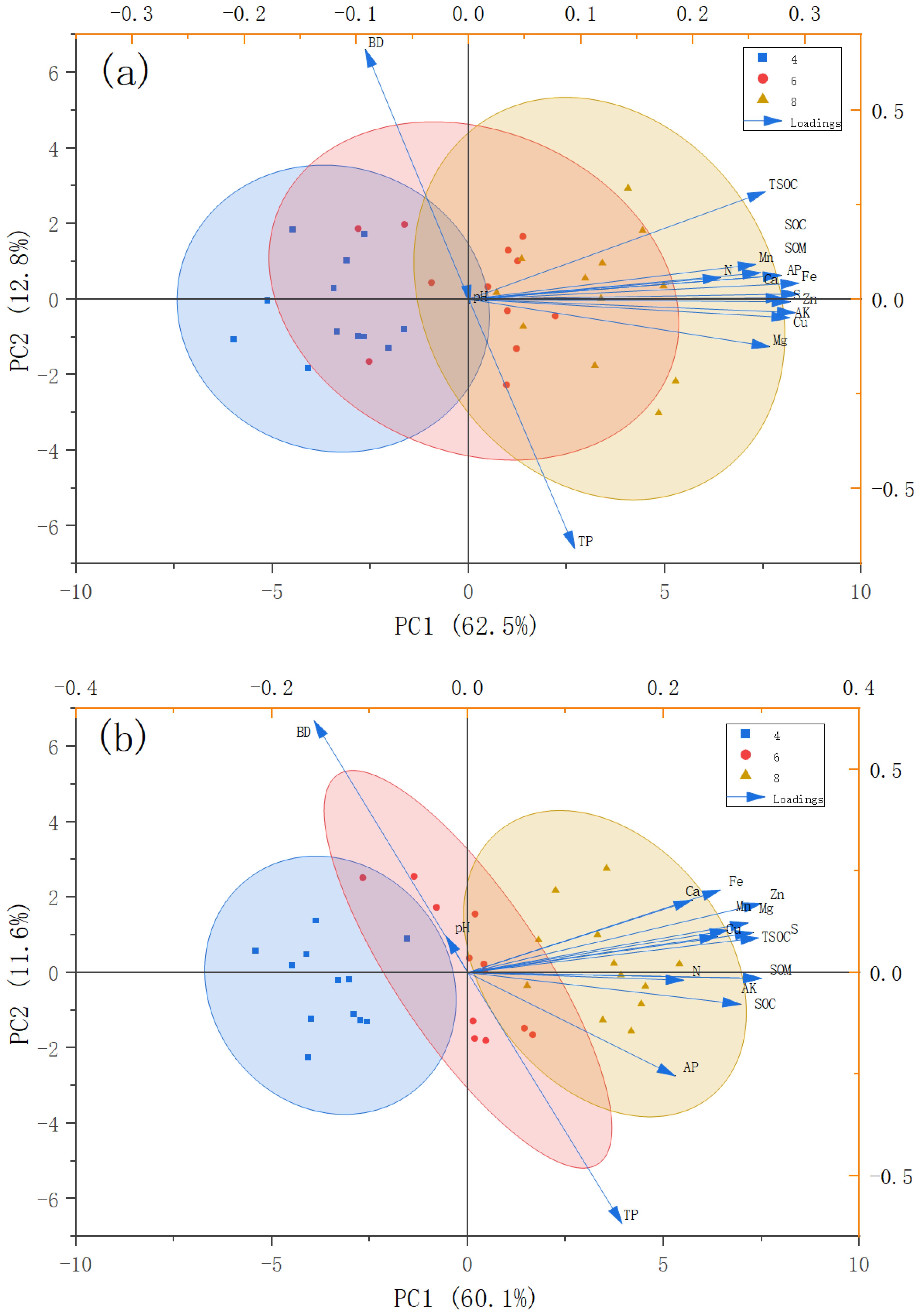 Figure 4. Combined PCA score and loading plot. (a) 0–20 cm surface soil; (b) 20–40 cm subsoil. AK, available potassium; AP, soil available phosphorus; SOM, soil organic matter; N, soil total nitrogen; SOC, soil organic carbon; pH, soil pH; Ca, exchangeable calcium; Mg, exchangeable magnesium; S, effective sulphur; Fe, effective iron; Mn, effective manganese; Cu, effective copper; Zn, effective zinc; BD, capacitance; TP, total porosity; and TSOC, soil organic carbon stocks. PC1 principal component 1; PC2, principal component 2.