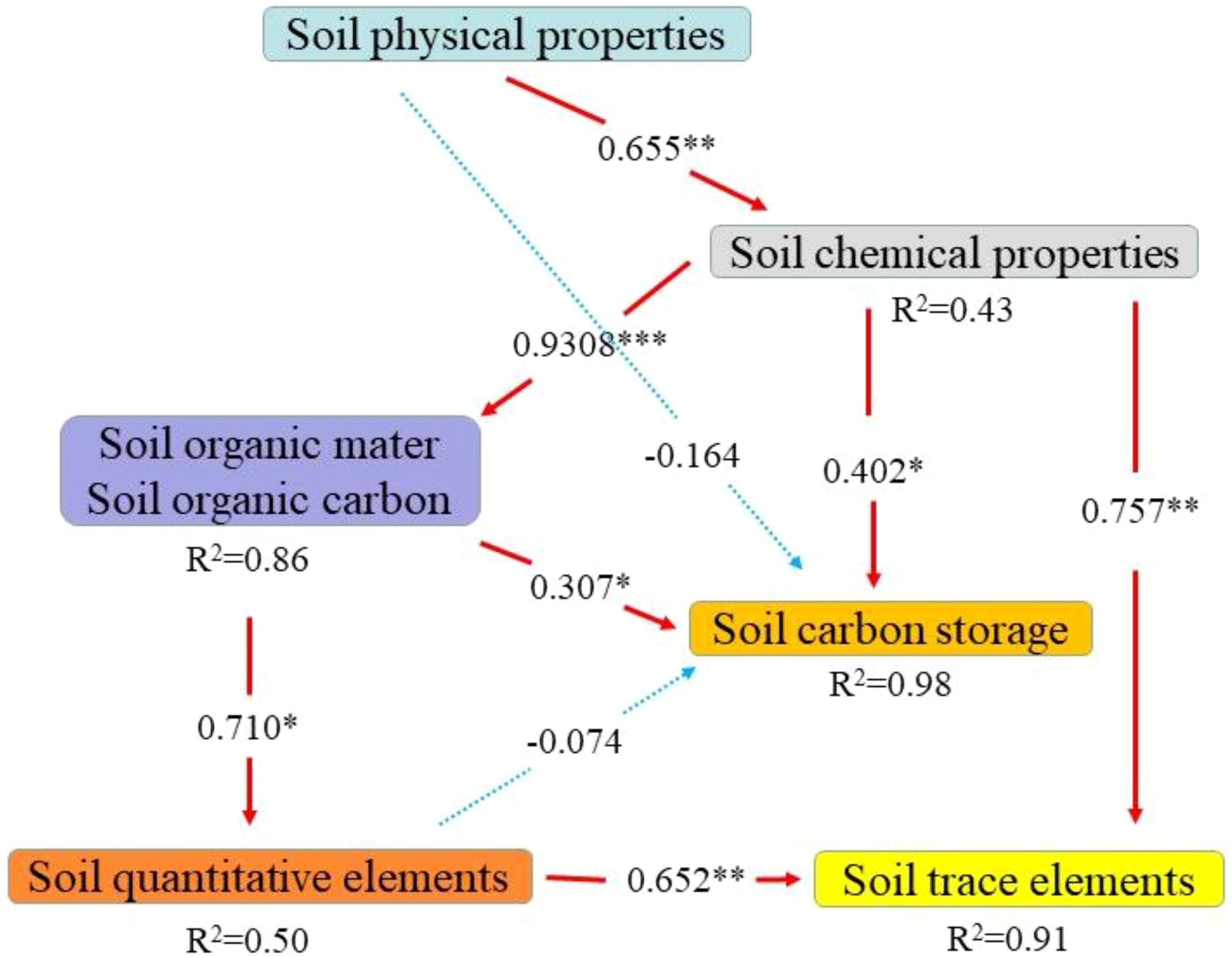 This study employed partial least squares structural equation model to analyze the influence mechanism of soil chemical properties, physical properties, organic matter, organic carbon, macro elements and trace elements on carbon storage. The GOF (goodness of fit) value of reached upto 0.8002, indicating that the fit was good. The results showed that the chemical properties of the soil were positively driven by the strong significant path coefficient of 0.655 (P<0.01). At the same time, a significant path coefficient of 0.402 (P<0.05) directly promotes the accumulation of carbon storage and participates in the carbon sequestration process. Organic matter and organic carbon served as primary components, with a highly significant path coefficient of 0.930 (P<0.001) indicating strong support for macro elements. Additionally, a significant indirect positive effect on trace elements was observed, with a path coefficient of 0.710 (P<0.01). It is noteworthy that physical indicators exert a negative effect of –0.1642 on carbon storage and an inhibitory effect of –0.079 on trace elements, indicating a potential ecological risk associated with changes in the physical state. Conversely, a strong positive correlation of 0.757 (P < 0.01) was observed between macro elements and trace elements, emphasizing their intermediary relationship (Figure 5).