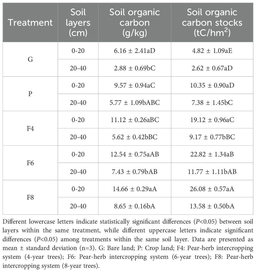 This study systematically quantified the effects of cover crops on soil organic carbon in pear orchards, revealing a novel mechanism through which herbaceous plants regulate the vertical distribution of soil carbon pools via root system architecture. Contrary to conventional understanding that primarily emphasizes litter input (Smith et al., 2020), we found that deep-rooted herbaceous plants (e.g., winter rapeseed) significantly enhanced soil organic carbon in the 20–40 cm deep layer (with an increase of 22.43% in 8-year-old orchards), surpassing the previous limited focus on surface carbon pools. In the unique shallow soil-bedrock abrupt-interface habitat of Fuping, deep-rooted plants successfully activated the traditionally difficult-to-utilize deep carbon pool, providing new insights into carbon cycle research in fragile ecosystems. While this study validates the theory that deep-rooted plants promote subsoil carbon sequestration (Borchard et al., 2019), it further reveals differences in carbon sequestration efficiency among herbaceous species: ryegrass demonstrated optimal performance in the surface layer (0–20 cm), with an increase of 18.51%-24.43%, whereas winter rapeseed exhibited greater advantages in deeper layers. This species-specific variability highlights the necessity of establishing a multidimensional evaluation system.