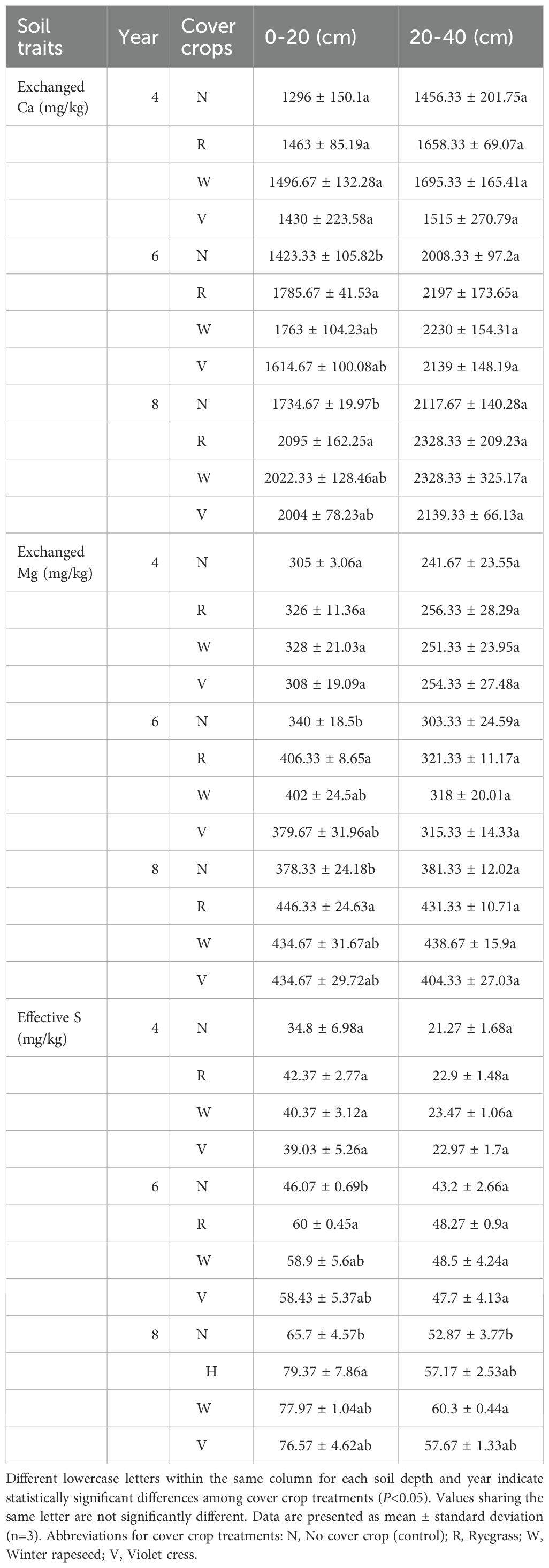In 8-year-old pear orchards, exchangeable calcium and magnesium increased by 33.9%-61.6% and 24.0%-46.3% respectively, while available sulfur rose by 88.8%-128.1% compared to 4-year-old orchards. Ryegrass treatment performed optimally, achieving exchangeable calcium and magnesium levels of 2095 mg/kg and 446.33 mg/kg respectively in 8-year-old orchards, with calcium content 20.8% higher than natural fallow. Compared to nitrogen-only treatment, ryegrass intercropping enhanced exchangeable calcium and magnesium by 25.5% and 19.5% in 6-year-old orchards, and by 30.3% and 20.8% in 8-year-old orchards. In the 20–40 cm subsoil, 8-year-old orchards reached exchangeable calcium levels of 2117.67-2328.33 mg/kg (45.4%-59.9% increase), with magnesium increasing by 57.8%-81.8% and available sulfur by 148.6%-183.5%, showing the most effectiveness under winter rapeseed treatment (Table 4). Although cover crops had weaker ameliorative effects on the subsoil than on the topsoil, both ryegrass and winter rapeseed maintained relatively high nutrient levels.