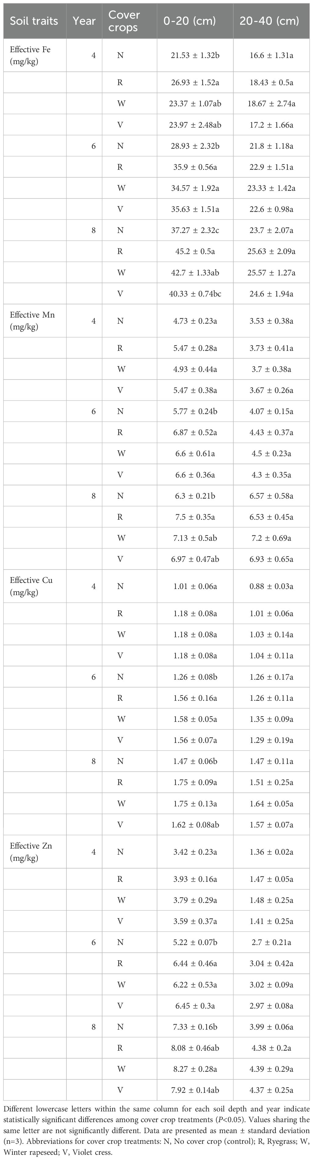 Pear orchard age and cover crop management significantly enhanced trace element concentrations in the 0–20 cm topsoil (P < 0.05). Compared to 4-year-old orchards, 8-year-old orchards showed increases of 73.1%-110.0% in available Fe, 33.2%-58.6% in Mn, 45.5%-73.3% in Cu, and 114.5%-141.8% in Zn. Ryegrass treatment notably improved Fe and Mn levels, with available Mn reaching 7.50 mg/kg, whereas winter rapeseed was most effective in enhancing Zn, achieving 8.27 mg/kg—a 12.8% increase over nitrogen-only fertilization (Table 5). Although trace element concentrations in the 20–40 cm subsoil were lower than in the topsoil, they still increased significantly with orchard age (P < 0.05). In 8-year-old orchards, available Fe, Mn, Cu, and Zn rose by 42.8%-54.4%, 85.3%-103.9%, 67.0%-86.4%, and 193.4%-222.6%, respectively. Winter rapeseed treatment generally maintained higher levels of most trace elements in the subsoil (Table 5).