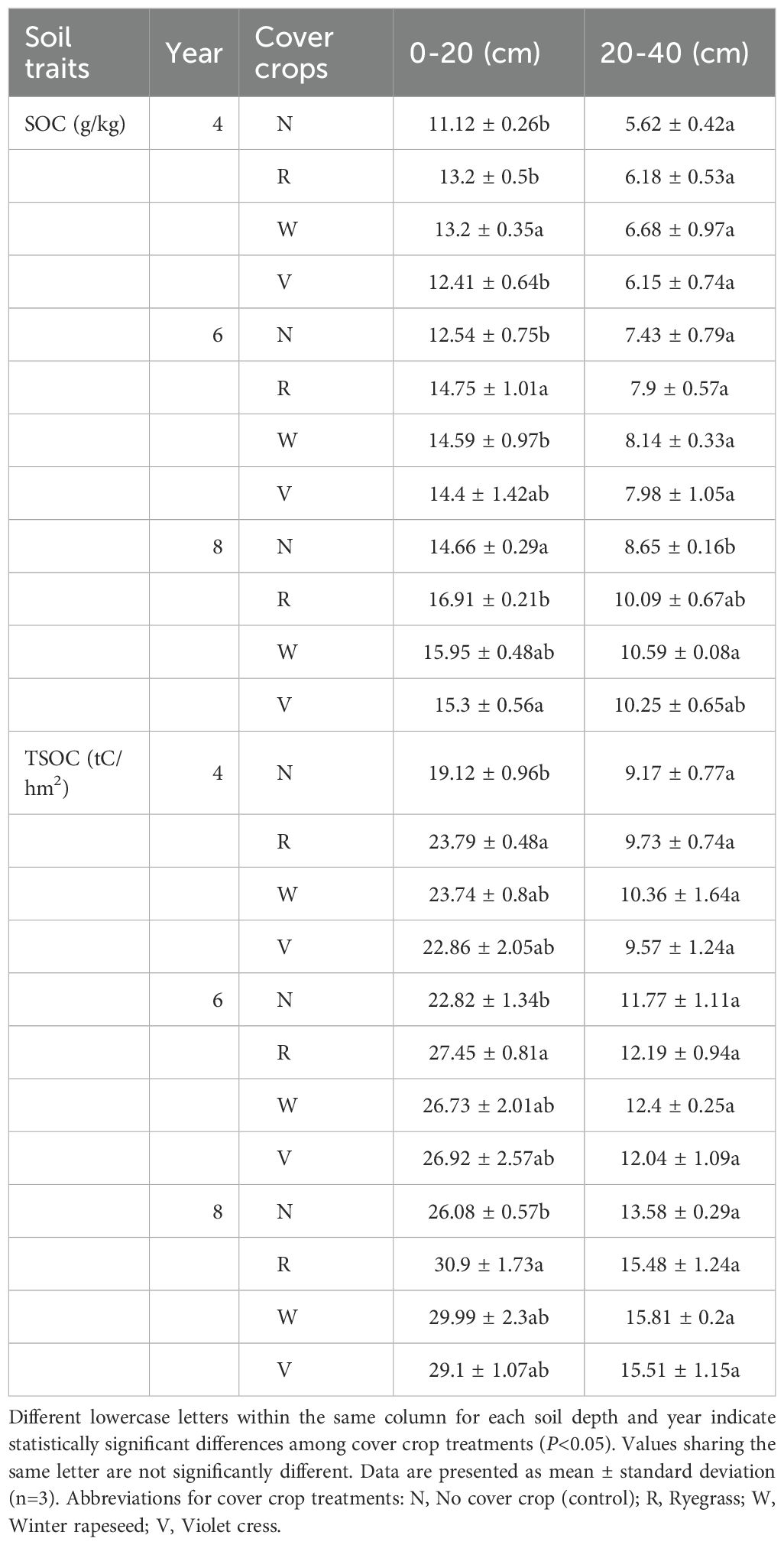 Violet cress treatment showed significant improvement in the first 6 years, with an 11.6%-14.8% increase in organic carbon, whereas, increase was only 4.4% in 8-year orchards. Although the organic carbon content and carbon storage in the 20–40 cm subsoil increased with orchard age and no significant differences were observed with the change of cover crop. It is worth noting that compared with the 4-year orchard, the 8-year orchard showed a significant increase of 31.8%-52.1% and a 36.4%-61.6% in the organic carbon content and carbon storage in the surface soil (Table 6).