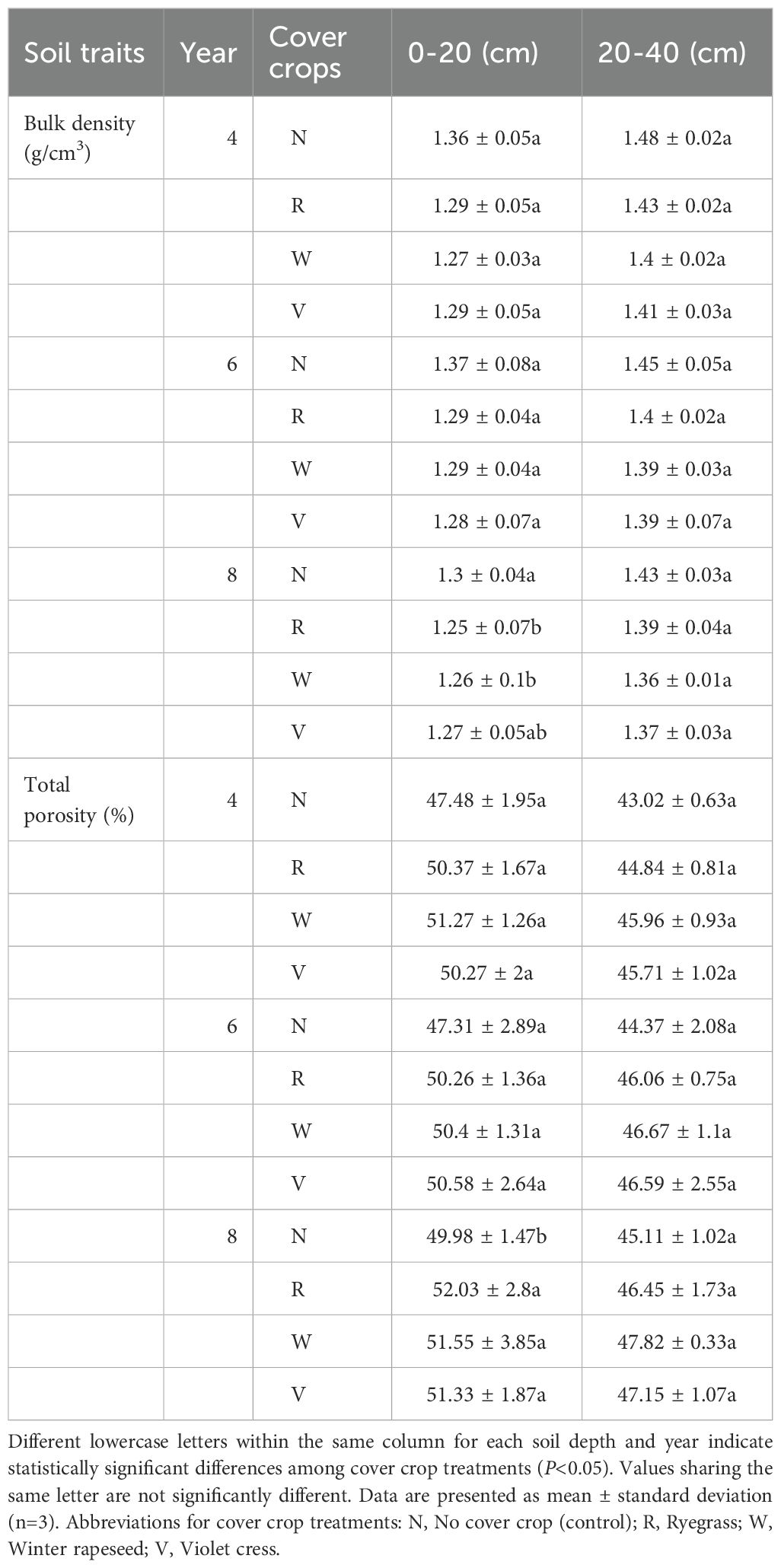 Pear orchard age and cover crop management significantly improved the physical structure of the 0–20 cm topsoil. All cover crop treatments significantly reduced soil bulk density, with decreases of 5.1%-6.6%, 5.8%-8.0%, and 3.1%-3.8% in 4-year, 6-year, and 8-year-old orchards, respectively. Winter rapeseed treatment reduced bulk density to 1.27 and 1.29 g/cm³ in 4-year and 6-year-old orchards. Cover crops also significantly increased total soil porosity. In 8-year-old orchards, porosity under ryegrass, winter rapeseed, and violet cress reached 52.03%, 51.55%, and 51.33%, respectively, representing a 2.1%-4.1% increase over natural vegetation (49.98%). Soil porosity showed an increasing trend with orchard age, with ryegrass treatment achieving a 3.3% increase (Table 7). Although the physical properties of the 20–40 cm subsoil are influenced by the pear orchard age and the cover crop, the magnitude of the change is less pronounced than topsoil. Cover crop treatment, generally resulted in lower bulk density compared to natural vegetation, with the lowest value of 1.36 g/cm³ observed in 8-year orchards under winter rapeseed. The reductions in bulk density across 4-year, 6-year, and 8-year orchards ranged from 3.4%-5.4%, 3.4%-4.1%, and 2.8%-4.9%, respectively, Porosity increased by 1.4%-4.3% under cover crops relative to natural vegetation cover, though difference were not statistically significant (P>0.05). Notably, the 8-year orchard with winter rape exhibited the highest porosity of 47.82%, indicating that long-term orchard cultivation may promote subsoil structure (Table 7).