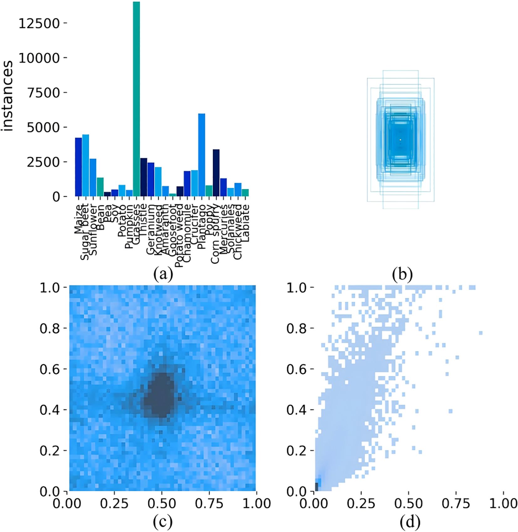 Figure 2. (a) Statistics and separation of data annotation files (Data annotation weed - species histogram); (b) Distribution map of the length and width of the dataset annotation box; (c) Histogram of the dataset variables x and y; (d) Histogram of the width and height of the dataset variables.