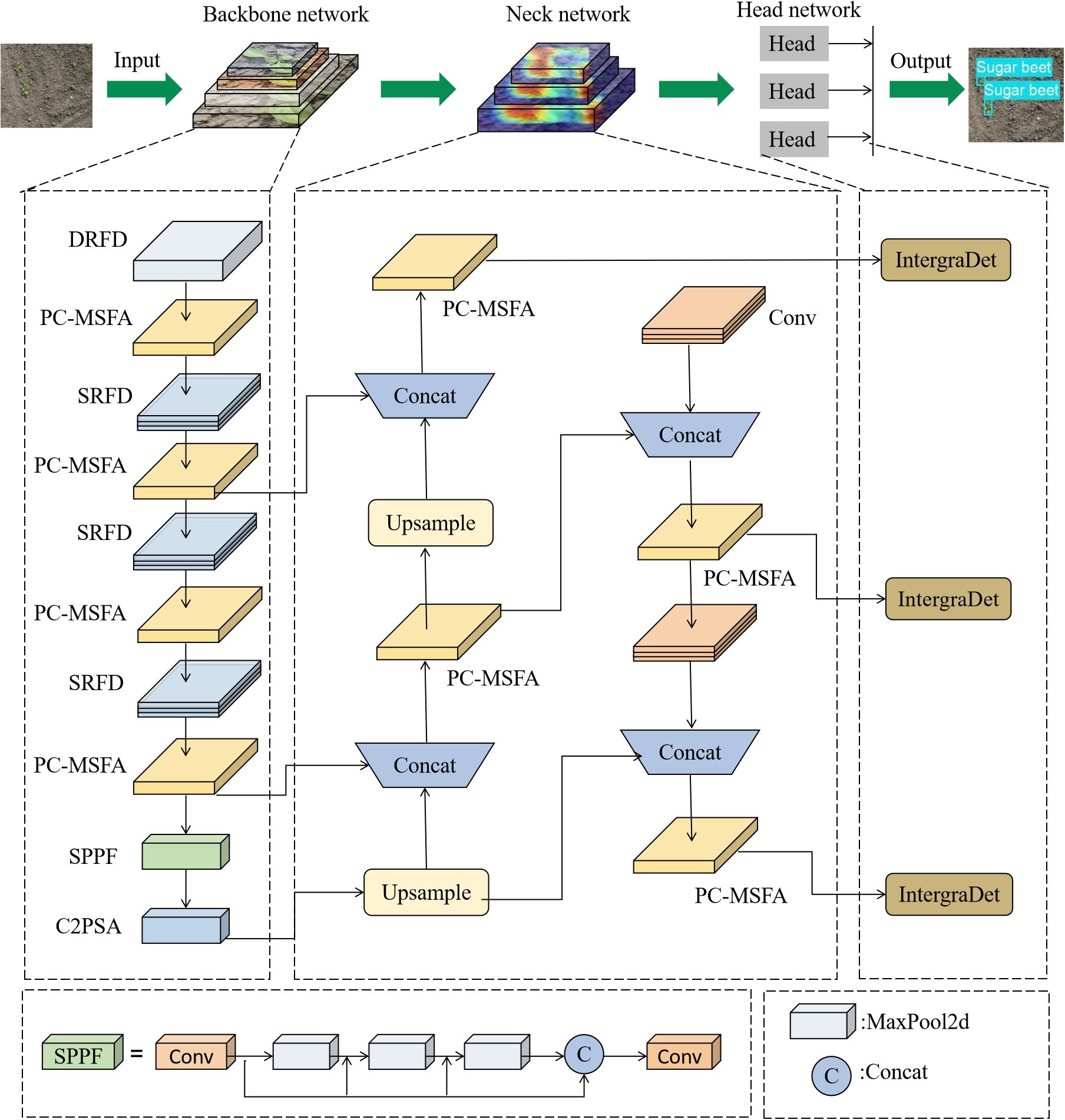 Traditional convolutional downsampling in object detection networks often leads to the loss of crucial spatial details, which is particularly problematic for detecting small weeds in agricultural fields. To address this issue, we propose the Hierarchical Robust Feature Network (HRFN), as shown in Figure 4, which replaces conventional downsampling layers in the YOLO11 backbone with two specialized modules: Shallow Robust Feature Downsampling (SRFD) and Deep Robust Feature Downsampling (DRFD).