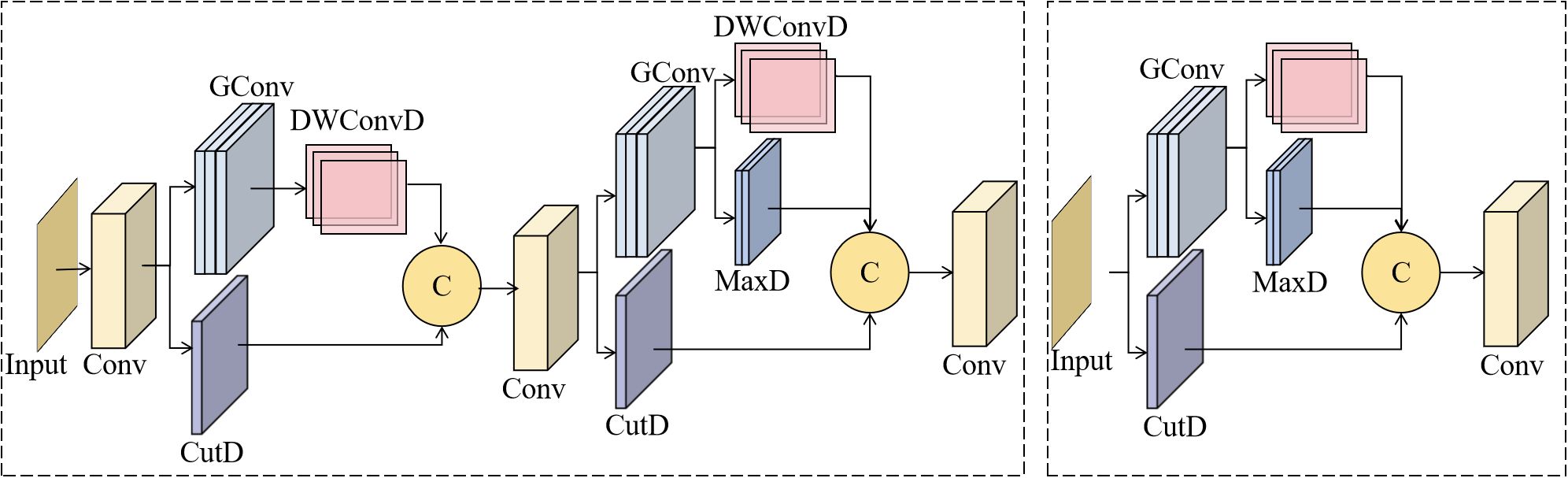 The SRFD module processes input images through a two-stage downsampling pipeline. Initially, a 7×7 convolution extracts preliminary features while preserving spatial resolution. In the first stage, the image size is halved using two parallel pathways: CutD, which retains spatial features through slicing, and ConvD, which employs grouped convolutions to extract local features. These features are then fused to retain both structural and semantic information. In the second stage, the resolution is reduced to a quarter, employing three parallel branches: ConvD for context, MaxD for prominent features, and CutD for spatial details, ensuring comprehensive feature preservation during the downsampling process.