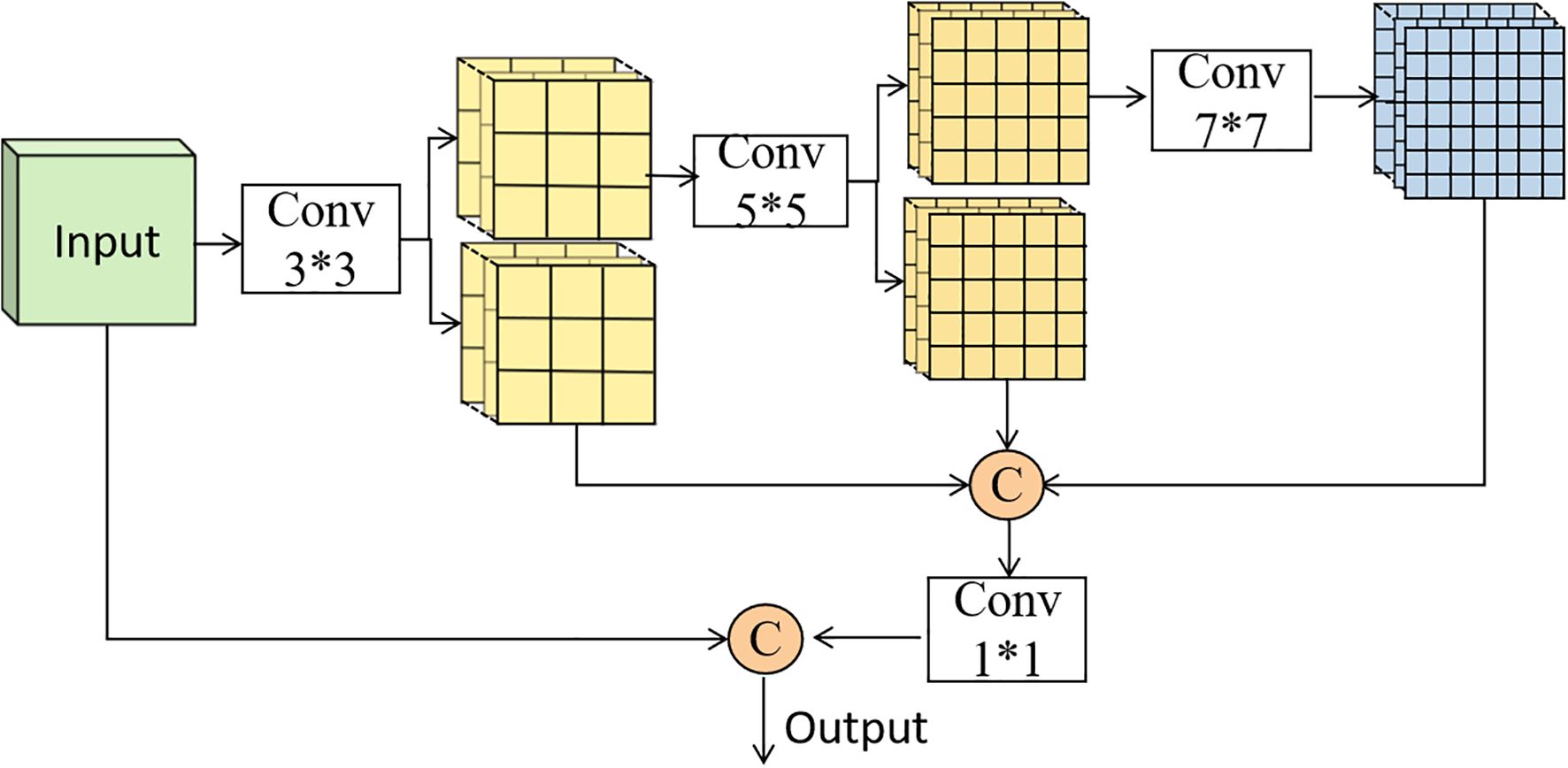 The standard C3K2 module in YOLO11 uses fixed-scale convolutions, limiting its ability to detect weeds at different growth stages. To overcome this, we propose the Partial Convolution Multi-Scale Feature Aggregation (PC-MSFA) module, which enhances multi-scale feature extraction efficiently. As shown in Figure 5, PC-MSFA employs a hierarchical processing strategy. Initially, the input features undergo a 3×3 convolution for basic feature extraction. These feature maps are then split into subsets: one subset is processed by a 5×5 convolution for medium-scale features, and another by a 7×7 convolution for capturing large-scale context. This partial convolution approach—applying different kernels to specific channel subsets rather than all channels—reduces computational overhead compared to full-scale processing at multiple levels.
