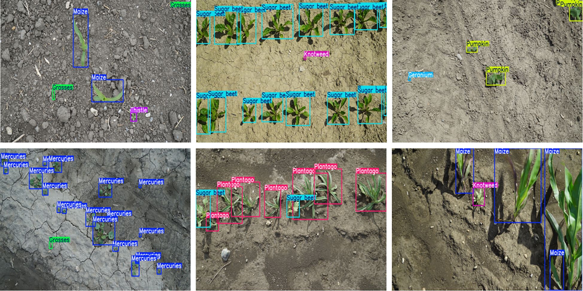 Figure 7. Based on the weed detection results of HDMS-YOLO, the colors of different boxes represent different types of weeds.