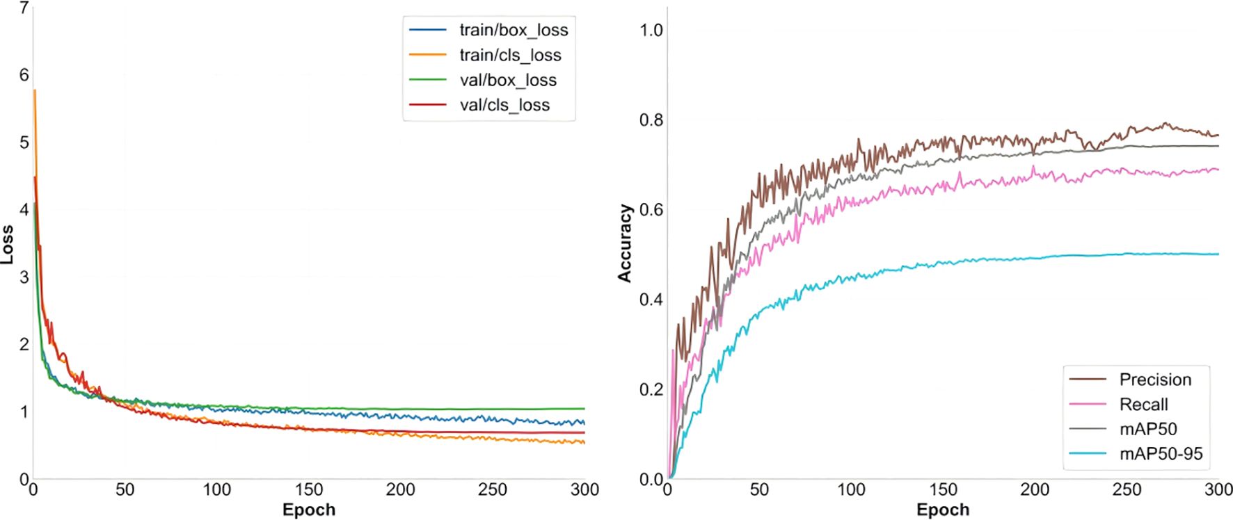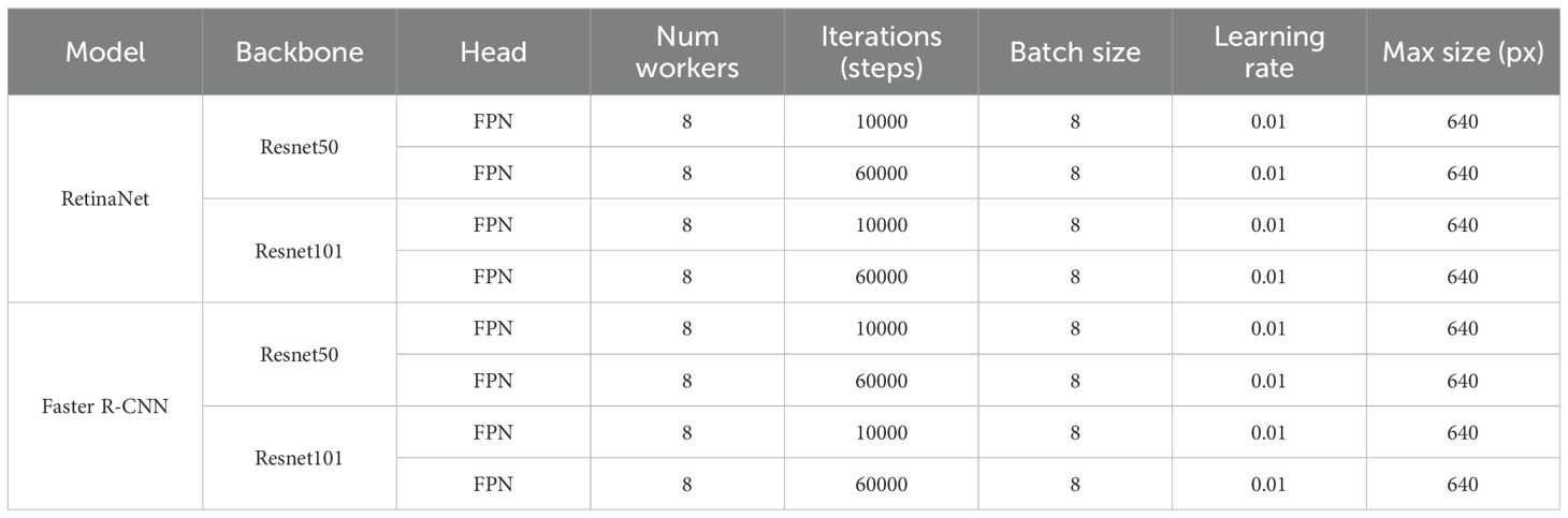 In our study, we employed RetinaNet along with Faster R-CNN. The model employs FPN as its head, with ResNet-50 and ResNet-101 serving as the backbone (Chen et al., 2019). Table 2 provides a summary of the training parameters. These parameters include iteration (the number of training iterations), Batch size (the number of data samples per iteration), learning rate (LR), and Maximum size (the maximum input image size).
