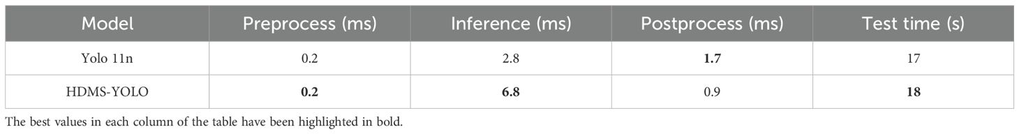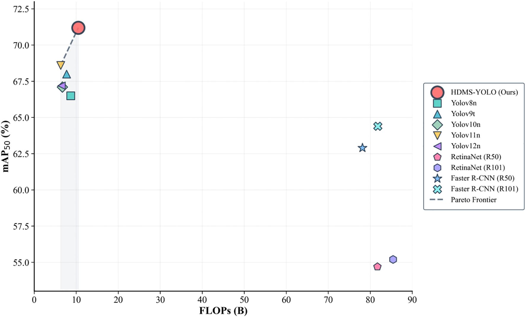 Beyond accuracy, HDMS-YOLO also demonstrates a favorable trade-off between precision and complexity. As shown in Figure 9, it achieved the highest mAP@50 among lightweight YOLO models while maintaining low FLOPs, improving by about 3 percent over YOLOv11n without a noticeable increase in computation. Unlike two-stage detectors such as RetinaNet and Faster R-CNN, which demand much higher computational cost but deliver lower accuracy, HDMS-YOLO thus proves particularly effective in low-resource environments. Its efficiency is further supported by the results in Table 7, where the model completed evaluation in 18 seconds with an inference time of 6.8 milliseconds per image. Although YOLOv11n achieved a slightly shorter total time of 17 seconds, its longer postprocessing offset the gain, and the marginal inference difference is negligible given the superior accuracy of HDMS-YOLO.