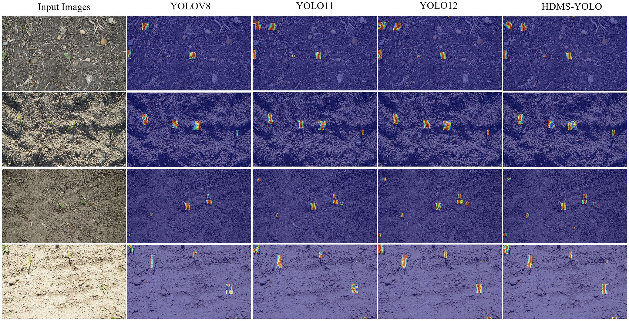 Figure 10 visually compares the weed detection effects of HDMS-YOLO with other models (YOLOv8, YOLO11, YOLO12). The results demonstrate that HDMS-YOLO outperforms multiple detection models, exhibiting a low missed detection rate and enhanced capability to detect small-target weeds. Nevertheless, accurate weed-crop detection remains challenging due to the insufficient availability of mixed samples of specific weed species with crops and the inherent difficulty in identifying small-target weeds.