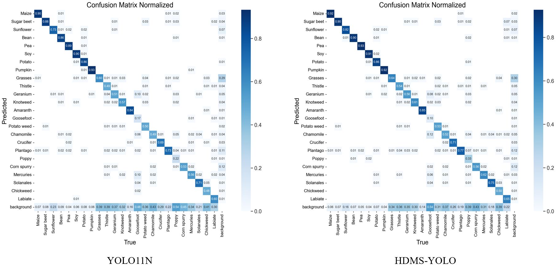 As shown in Figure 11, the confusion matrices provide a comparative analysis of the classification results between the YOLO11 base model and HDMS-YOLO on the Weed dataset. The YOLO11 model performs well in most categories, but notable misclassifications are observed. For example, Grasses and Sunflower are frequently confused with Soy, as indicated by the recall values of 55.6% and 72.4%, respectively. The background class also shows significant overlap with Grasses and Thistle, leading to missed detections. This suggests that the model struggles with distinguishing between weeds and crops with similar visual features, particularly in complex or cluttered scenes.