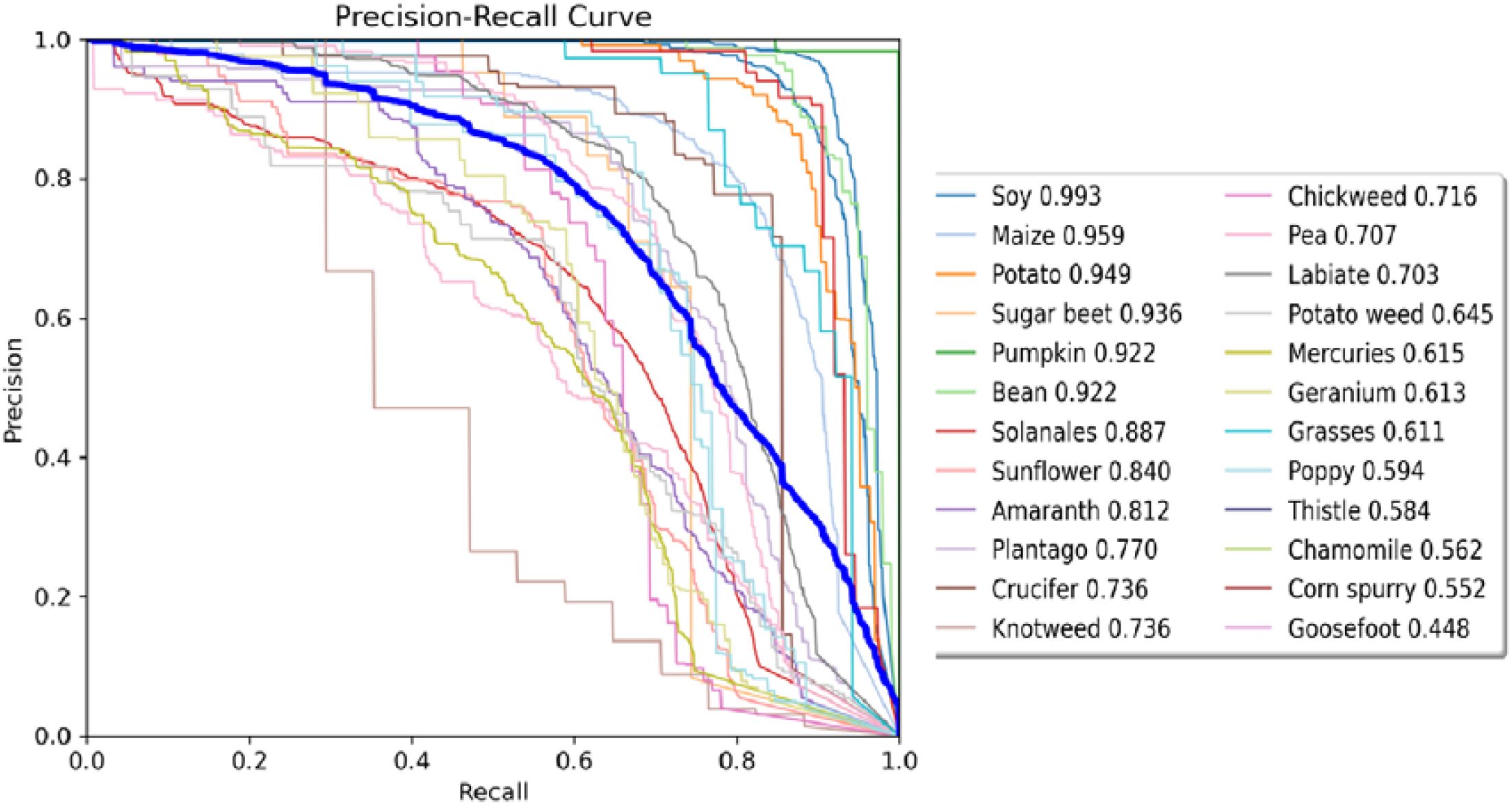 The precision-recall curve in Figure 12 further illustrates HDMS-YOLO’s improved performance. Soy stands out with 99.3% precision and recall close to 1.0, demonstrating near-perfect detection. Maize and Potato also show strong performance, with precision values of 95.9% and 94.9%, respectively. However, classes like Grasses (precision = 61.1%, recall = 39%) and Chickweed (precision = 71.6%, recall = 52%) show lower performance, primarily due to their visual similarity to other species and limited sample sizes in the dataset. The Poppy and Goosefoot classes exhibit even lower recall, with Poppy at 31% and Goosefoot at 25%, which reflects challenges related to class imbalance and visual similarity to other weeds.