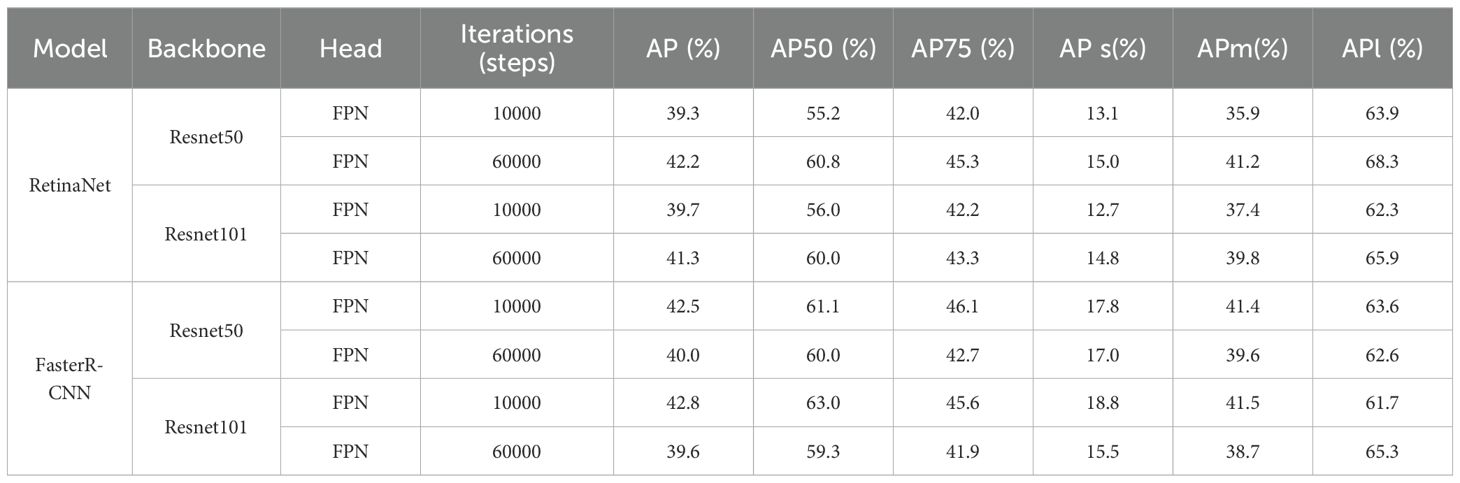 Table 3. Different models based on MMDetection, training iterations, and model evaluation metrics under the backbone network. In the MMDetection framework, AP stands for Average Precision (mAP).