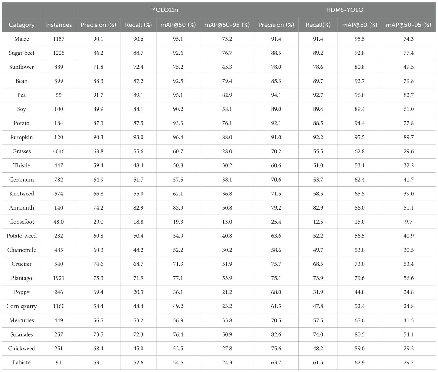 Discussion: The proposed HDMS-YOLO model exhibits strong capability in extracting and representing weed features, leading to improved identification accuracy and generalisation. These results highlight its potential application in precision farm management and the development of intelligent weed-removal robots for unmanned agricultural systems.
