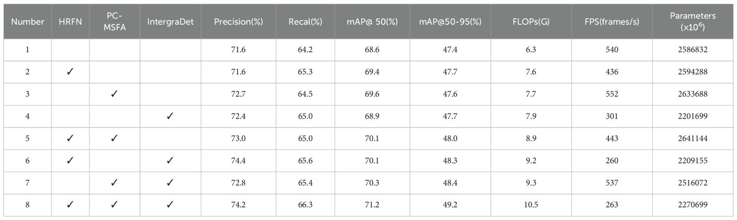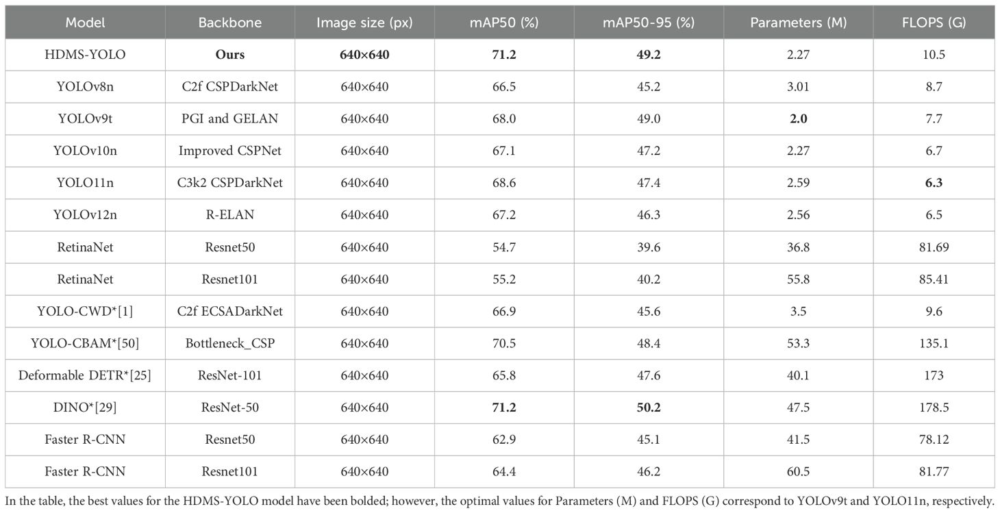 To comprehensively evaluate the effectiveness of HDMS-YOLO, we compared it with mainstream detectors, optimized variants, and transformer-based models. As shown in Table 6, HDMS-YOLO achieved an mAP@50 of 71.2 percent and an mAP@50–95 of 49.2 percent, outperforming lightweight models such as YOLOv8n, YOLOv10n, and YOLOv12n (Talaat and ZainEldin, 2023; Tian et al., 2025; Wang et al., 2024), and maintaining a 0.2-point lead over YOLOv9t (Yaseen, 2024). It also surpassed optimized variants, exceeding the YOLO-CWD model proposed by Ma et al. with 66.9 percent and 45.6 percent, and the YOLO-CBAM model proposed by Wang et al. with 70.5 percent and 48.4 percent (Ma et al., 2025; Wang et al., 2022). Compared with transformer-based detectors, HDMS-YOLO approached the accuracy of DINO (Zhang et al., 2022), which reached 50.2 percent mAP@50-95, and outperformed Deformable DETR (Zhu et al., 2020) with 47.6 percent, while requiring only 10.5 GFLOPs, far less than their 178.5 and 173 GFLOPs.