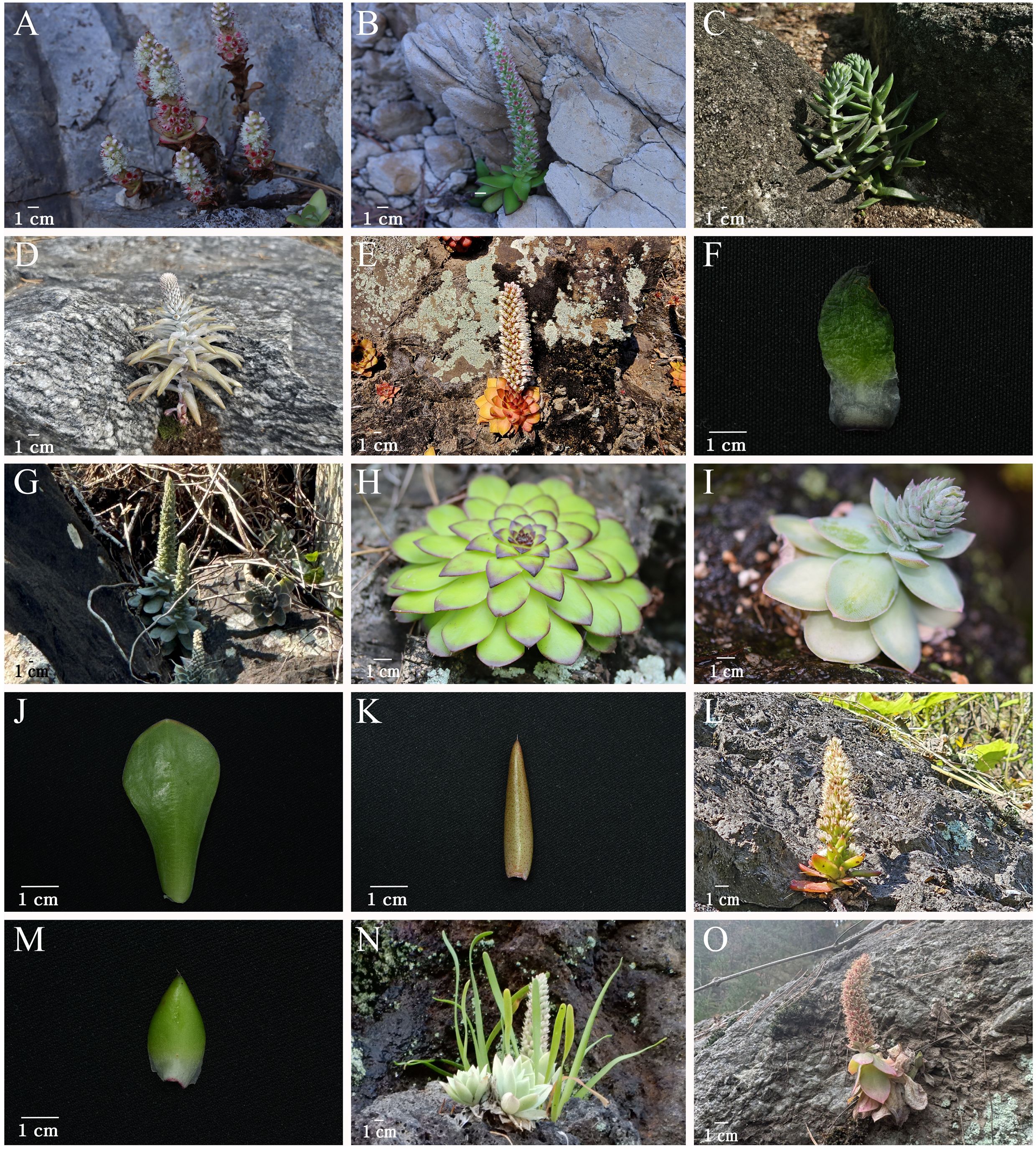 A series of fifteen images show various succulents and their parts against different backgrounds. Each image has a scale bar indicating size at 1 centimeter, showcasing the plants’ diversity in form and texture, including rosettes, stems, and individual leaves. Some images have plants growing on rocky surfaces, while others display close-ups of plant parts on a black background, highlighting their detailed features and colors.