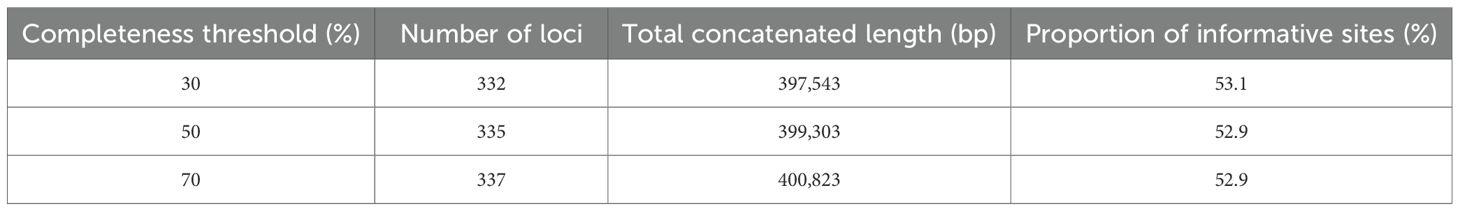After sequence assembly, alignment, and quality filtering, the supercontig datasets were filtered to include loci recovered in at least 30%, 50%, and 70% of the sampled taxa, resulting in three matrices of varying completeness and size: the 30% threshold dataset comprised 332 loci with a total concatenated length of 397,543 bp, the 50% threshold dataset comprised 335 loci with a total concatenated length of 399,303 bp, and the 70% threshold dataset comprised 337 loci with a total concatenated length of 400,823 bp (Table 2; Supplementary Tables S4-S6).