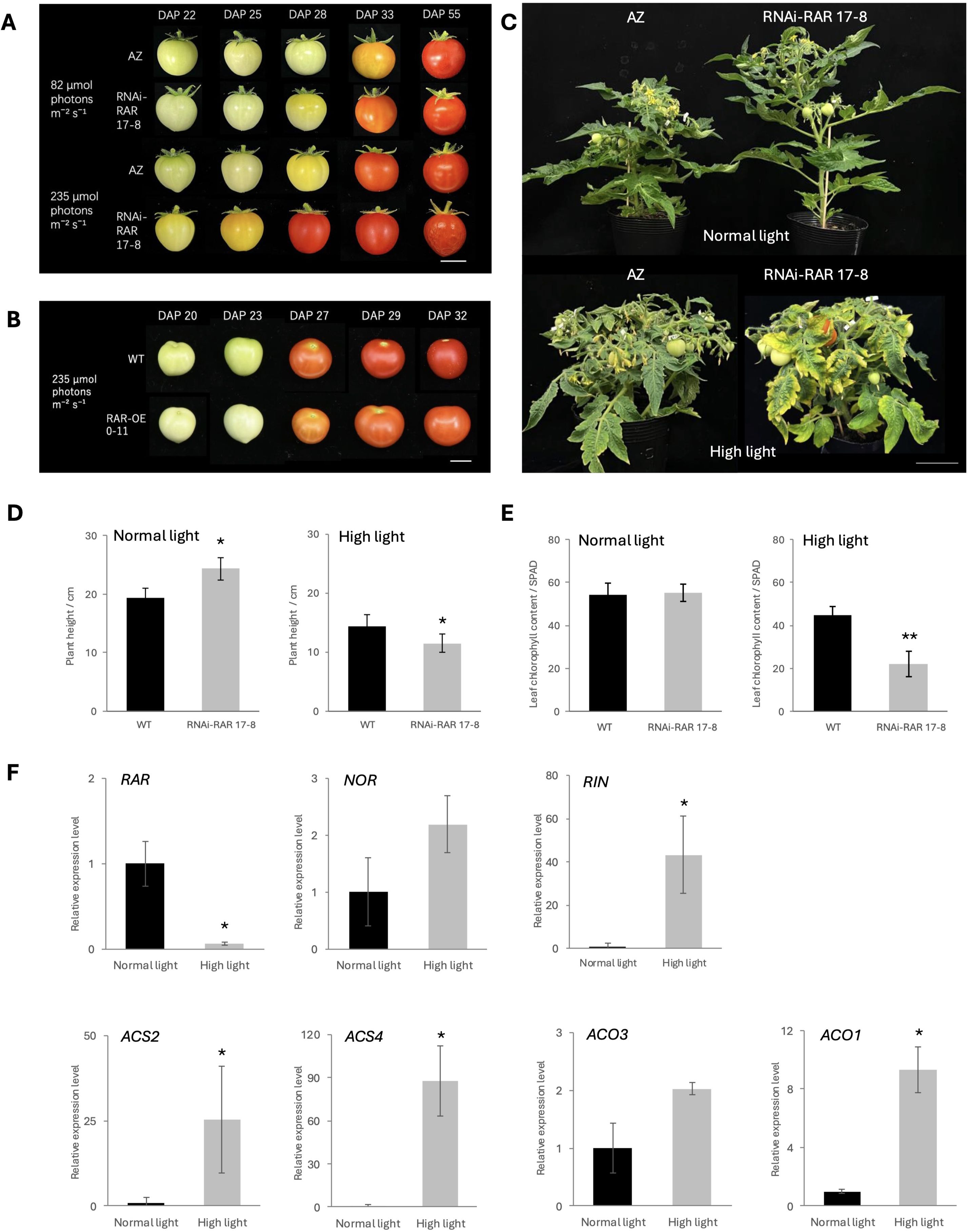 To further evaluate the phenotypic consequences of RAR silencing, we assessed the overall vegetative growth status, including plant height and leaf senescence. Under standard light conditions (82 µmol photons m-² s-¹), RNAi-RAR 17–8 plants exhibited significantly increased height compared to AZ control plants. In contrast, under high light intensity (235 µmol photons m-² s-¹), the RNAi-RAR 17–8 plants showed reduced height relative to WT-J and AZ controls, accompanied by a more compact canopy structure (Figures 1C, D). Notably, RNAi-RAR 17–8 plants exhibited pronounced leaf yellowing under high light conditions, indicative of accelerated senescence. Consistently, chlorophyll content measured in the leaves of RNAi-RAR 17–8 plants was significantly lower than that of WT-J plants following equivalent durations of high light exposure (Figure 1E). To investigate whether RAR expression is regulated by light conditions and to evaluate transcriptional changes in ripening-related genes, we performed quantitative real-time PCR on MG stage fruits of WT-J grown under different light conditions. RAR expression was significantly reduced under high light, while RIN and several ethylene biosynthetic genes (ACS2, ACS4, ACO1) were significantly upregulated. NOR and ACO3 showed increasing trends but without statistical significance (Figure 1F).