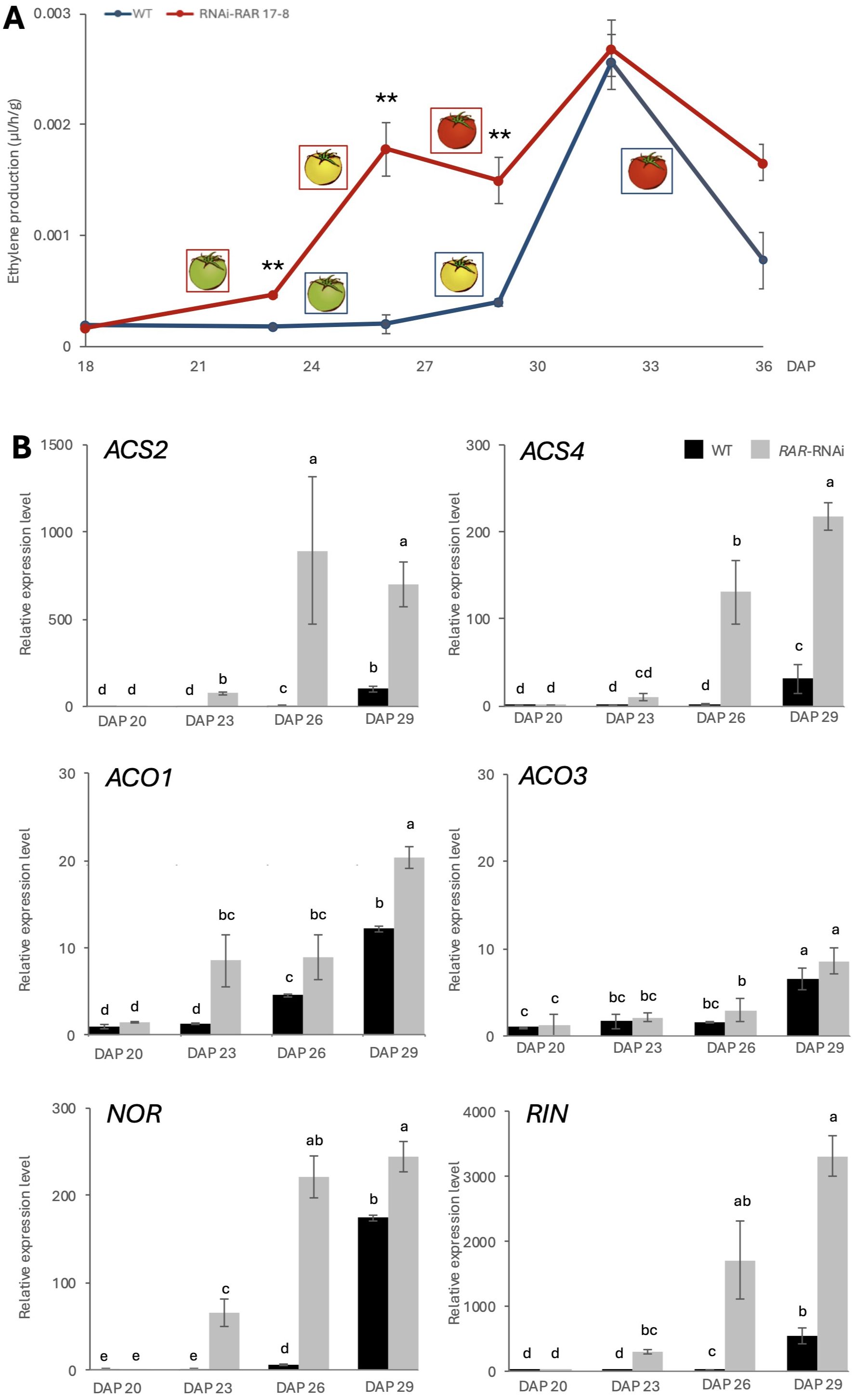 Figure 2. Ethylene production and related gene expression. (A) Gas chromatography (GC) analysis of ethylene production from WT-J and RNAi-RAR 17–8 fruits. Error bars represent the standard deviations. Significant differences were determined by two-tailed Student’s t test (**p < 0.01), n = 5. (B) Relative expression level of ethylene biosynthesis genes (ACS2, ACS4, ACO1, ACO3) and key fruit ripening transcription factors (NOR, RIN) in RNAi-RAR 17–8 lines compared to WT-J from DAP23 to DAP29. Error bars represent the standard deviations. Letters indicate significant differences according to Tukey’s test (p < 0.05), n = 3. DAP means “Days After Pollination”.