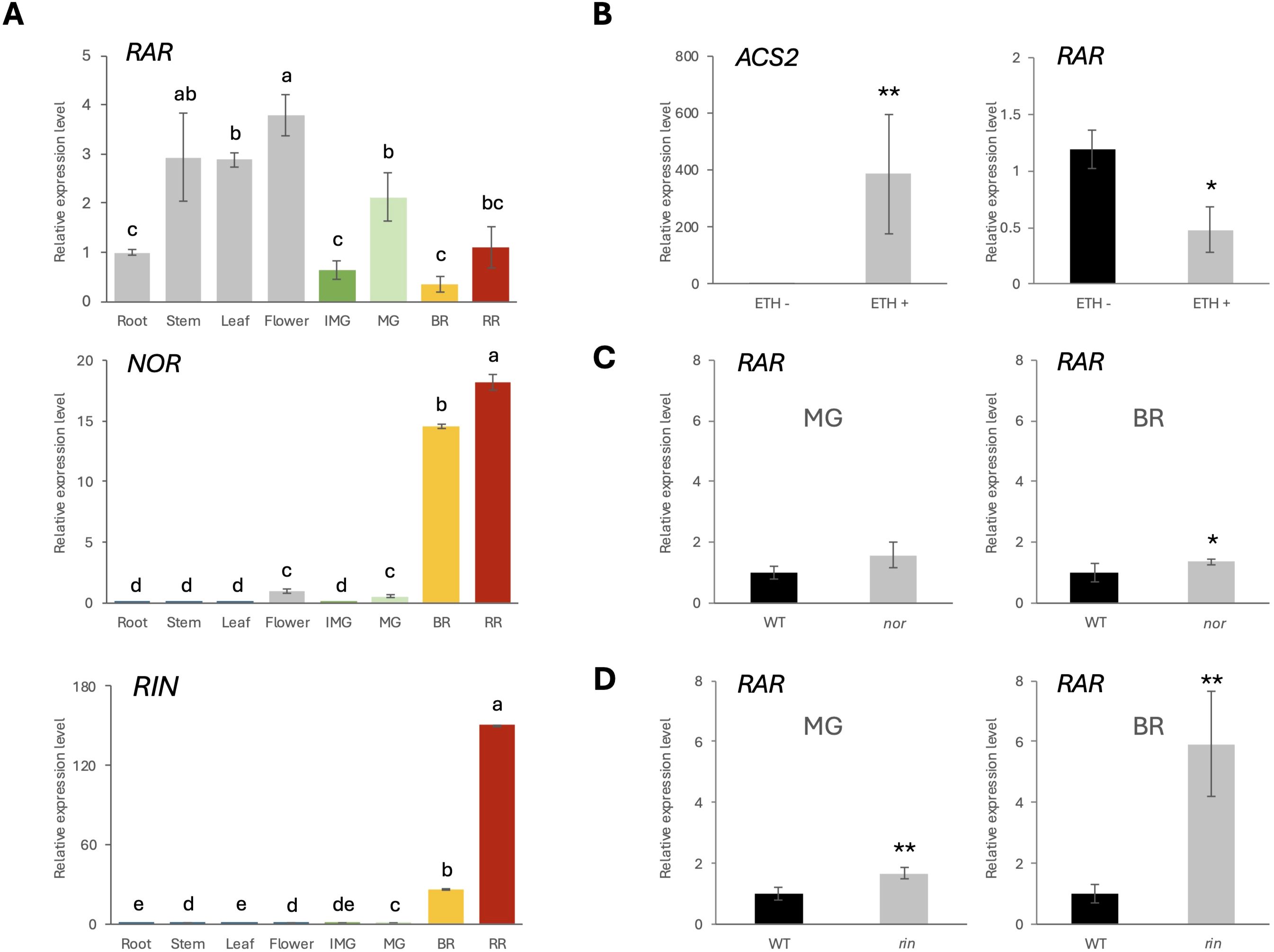 Figure 3. Interregulation between RAR, NOR and RIN. (A) Relative expression level of RAR in WT-J root, stem, leaf, flower and fruits at IMG, MG, BR, RR stage. Error bars represent the standard deviations. Letters indicate significant differences according to Tukey’s test (p < 0.05), n = 3. (B) Relative expression level of ACS2 and RAR in WT-J MG fruits with exogenous ethylene treatment (1000 ppm for 24 hours). (C, D) Relative expression level of RAR in WT-B, nor and rin mutants at MG or BR stage, respectively. Error bars represent the standard deviations. Significant differences were determined by two-tailed Student’s t test (*p < 0.05; **p < 0.01), n = 3.