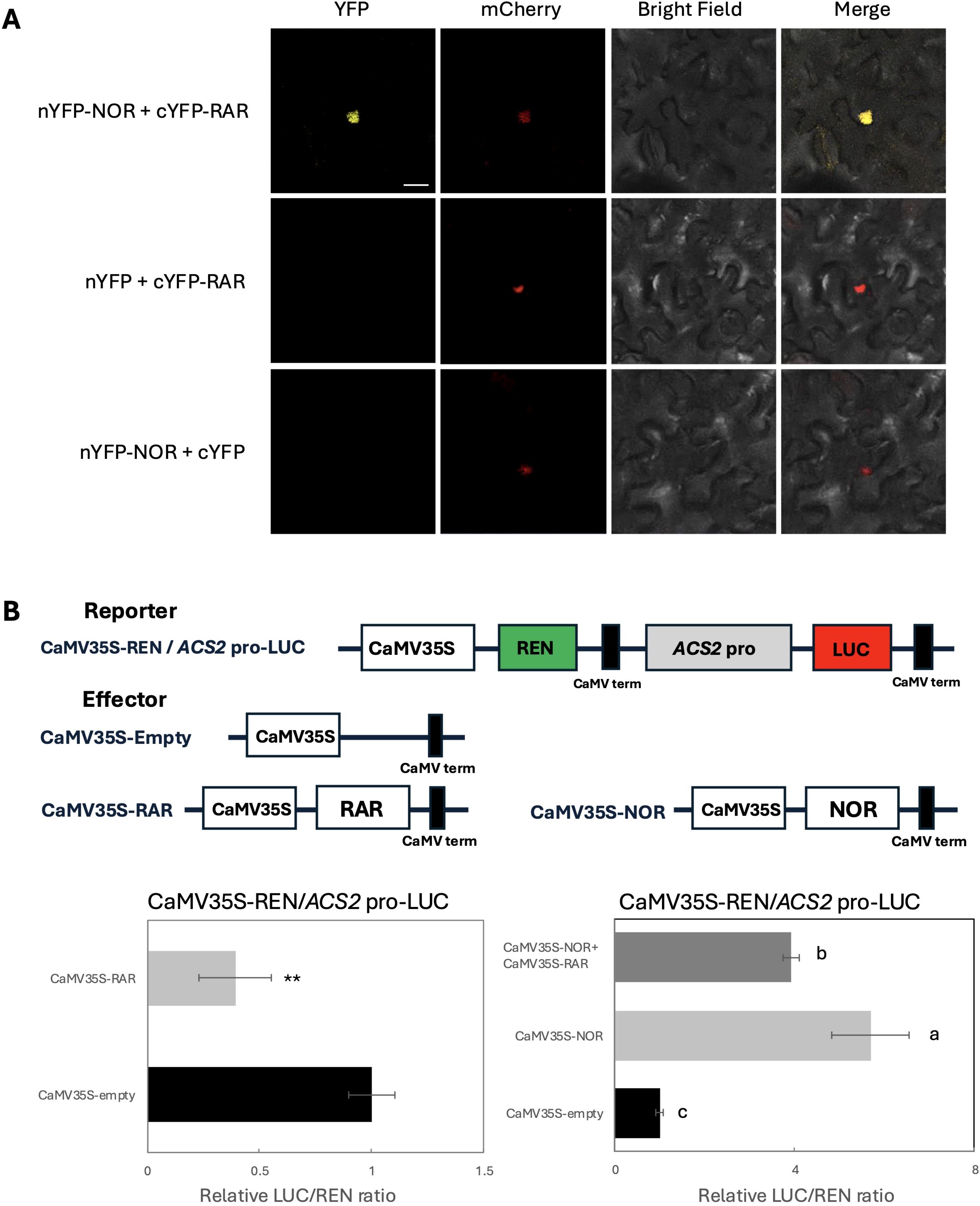 Figure 4. Down regulation of NOR-mediated activation of the ACS2 promoter through RAR-NOR interaction. (A) BiFC assays showing the molecular interaction between RAR and NOR. AHL22-mCherry was used as a nuclear marker. Scale bars: 20 µm. (B) Dual-luciferase assays showing the effect of RAR on the transcriptional activity of ACS2. RAR and NOR were driven by 35S promoter as an effector. 1kb of ACS2 promoter were used to drive LUC as a reporter. The activation of ACS2 promoter by RAR was shown by the ratio of LUC to REN. Data are the mean ± SD of 5 biological replicates. Letters above the bars of the figure on the left indicate statistically significant differences (Student’s t test; **p < 0.01), n = 5. Error bars of figure on the right represent the standard deviations. Letters indicate significant differences according to Tukey’s test (p < 0.05), n = 5.