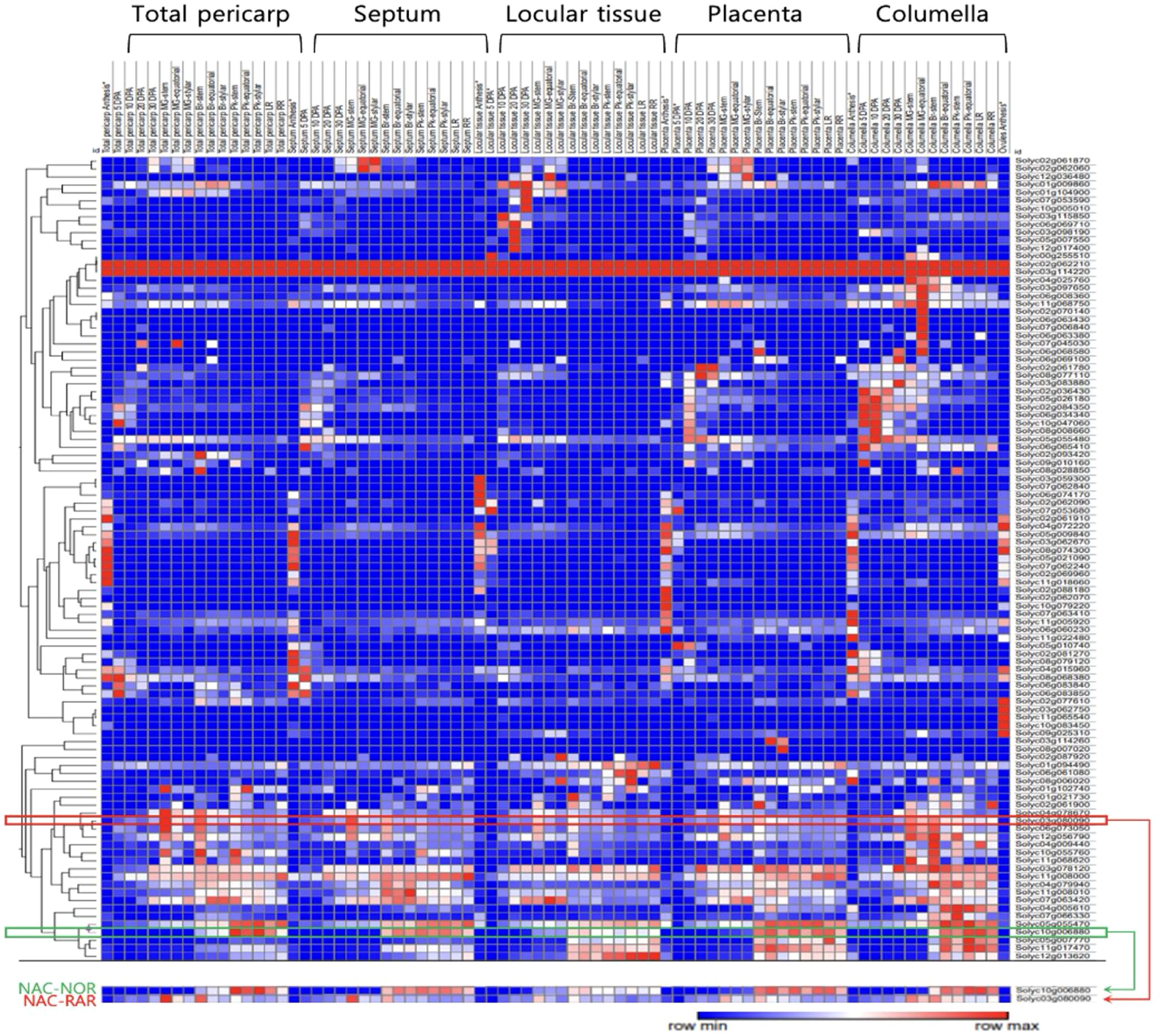 Figure 5. Comparative analysis of RAR and NAC family gene expression. Heat map showing expression profiles of 101 tomato NAC genes (rows) across fruit tissues (columns: total pericarp, septum, locular tissue, placenta, columella) from anthesis to the RR stage. The expression data of all NAC transcription factor family members was visualized and analyzed using Morpheus.