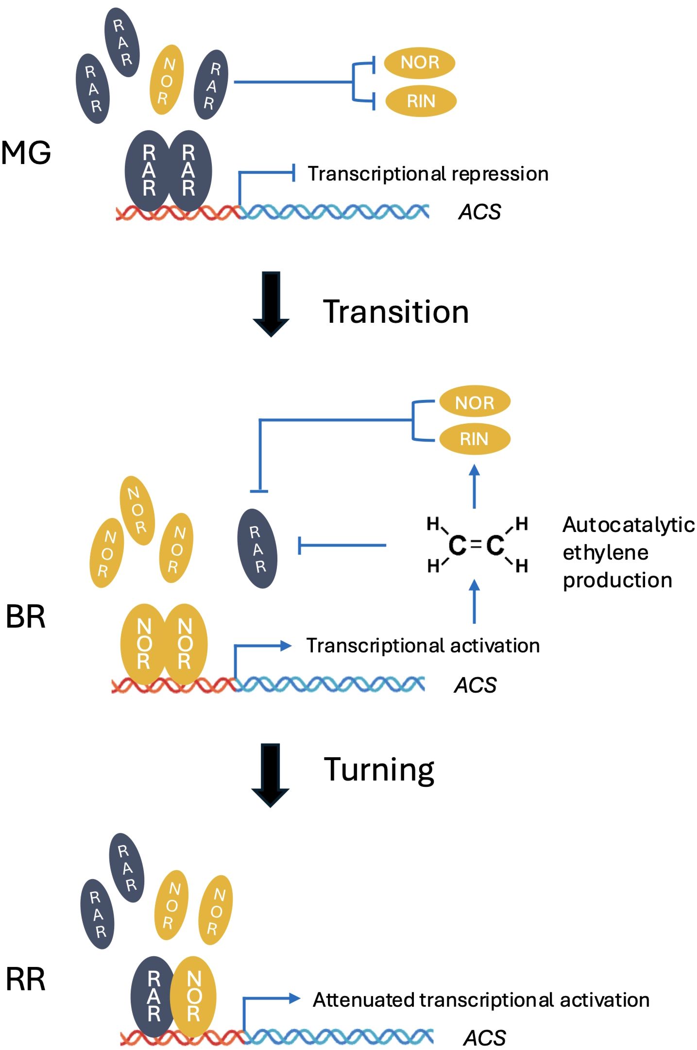 Figure 6. At the MG stage, high RAR abundance allows it to form homodimers, thereby repressing ACS2 transcription and preventing premature ethylene biosynthesis. Once the autocatalytic ethylene synthesis loop is initiated, ethylene, together with NOR and RIN, represses RAR expression, thus relieving this inhibition and enabling full activation of the ripening regulatory cascade. At the RR stage, RAR levels remain lower but still sufficient, and may tend to form heterodimers with NOR, thereby attenuating the transcriptional activation of ACS2 and fine-tuning ethylene production during late ripening.