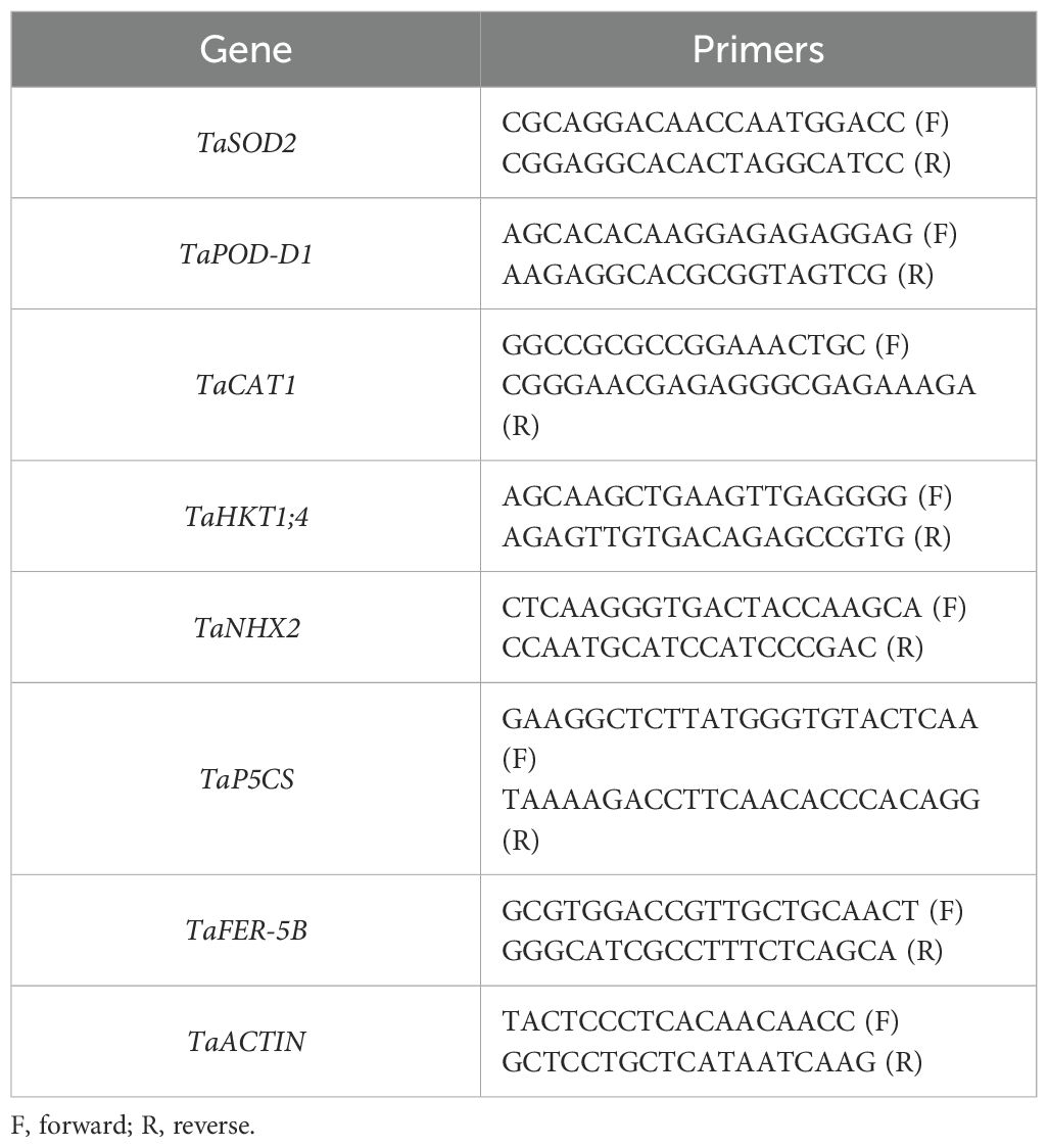 Total RNA was extracted from the selected wheat leaf samples using an RNA extraction kit from Sigma Aldrich. This was done in accordance with the standard protocol by Li et al. (2019) for the expression analysis of salinity-responsive genes (TaSOD2, TaPOD-D1, TaCAT1, TaHKT1;4, TaNHX2, TaP5CS, and TaFER-5B). Following this, cDNA synthesis was performed according to Ahmed et al. (2022). In this case, qRT-PCR analysis was performed with 2µg of total RNA. The expression levels of the genes of interest were calculated in relation to the reference gene TaActin1. Table 1 contains the primer sequences used in the analysis.