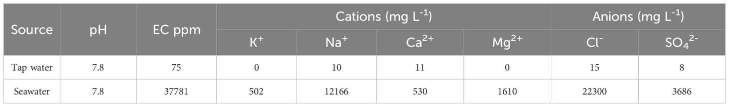 Diluted seawater solutions were prepared in concentrations of 0, 2000, 4000, and 6000 ppm, using seawater sourced from the Red Sea. The dilutions were prepared using Olsen (1986) formula. The hydrogen potential (pH) by a Man-Tech PC-1300–475 E pH meter, electrical conductivity (EC) ppm by a Hanna HI 5521 EC meter, cations and anions (mgL-1) by (ICP-OES, Varian 720-ES) in both tap water and seawater were analyzed.