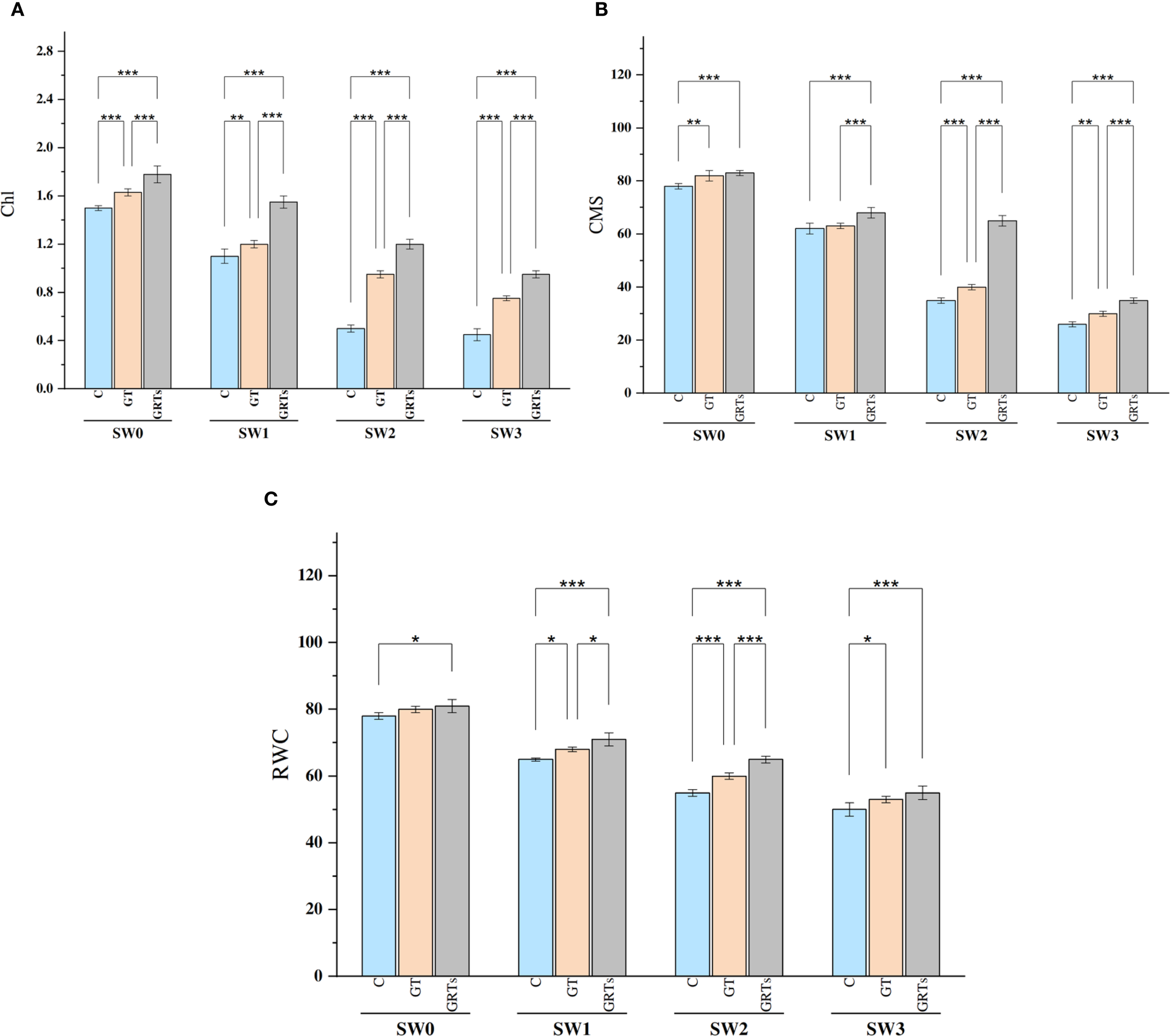 Conversely, Chl, CMS, and RWC values significantly improved with increasing levels of biofertilizer application from the control (C) to the GRTs treatment, while a slight reduction was observed under GT compared to GRTs. Notably, under the interaction between salinity and biofertilizer (salinity × BF), the GRTs treatment consistently enhanced Chl, CMS, and RWC across all salinity levels. Overall, despite the improving effects of biofertilizers, increasing seawater concentration led to a progressive decline in Chl, CMS, and RWC in wheat.