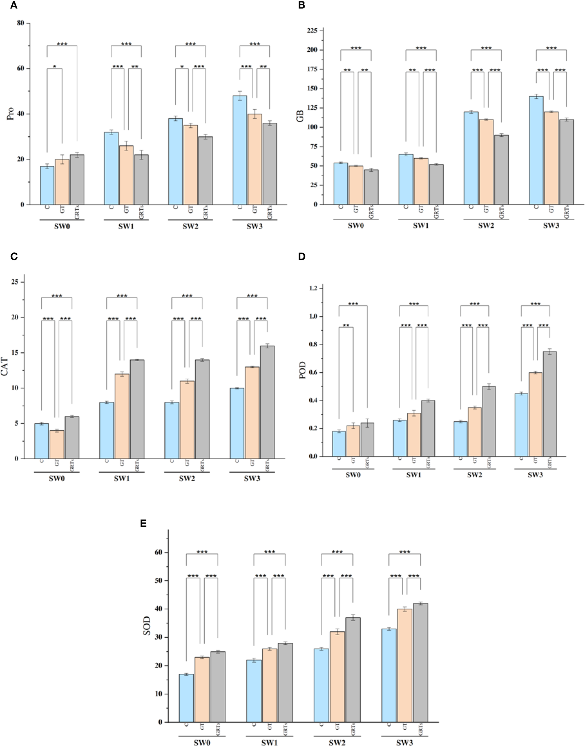 Effect of different concentrations for salinity stress by seawater (SW) 0,2000,4000 and 6000 ppm with biofertilizers (BF) treatments (C, control; GT, grain treatment; GRTs, grain and root treatment) on content of proline (Pro) μgg-1 FW, glycine betaine (GB) μgg-1FW, and antioxidant enzymes activity of catalase (CAT), peroxidase (POD) and superoxide dismutase (SOD) Enzyme units in used wheat cultivar (Yecora rojo) at flowering stage (A–E). Values in the graph are means averaged after 6 weeks of stress application at a p-value ≤ 0.05. Statistical significance is indicated by asterisks (*p ≤ 0.05, **p ≤ 0.01, *p ≤ 0.001).